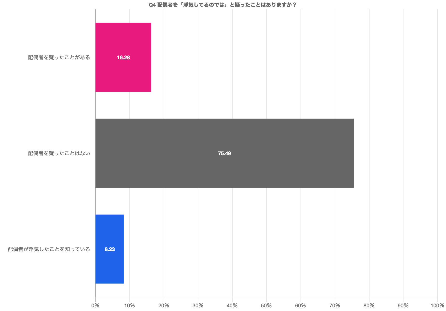 すると、「配偶者の浮気を疑ったことがある」人は16%程度となり、「浮気をしたことがある」人より少ない割合となりました。