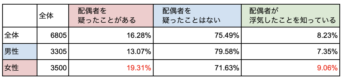 男女比較すると女性のほうが「疑ったことがある」「浮気したことを知っている」と回答する人が多い結果になりました。