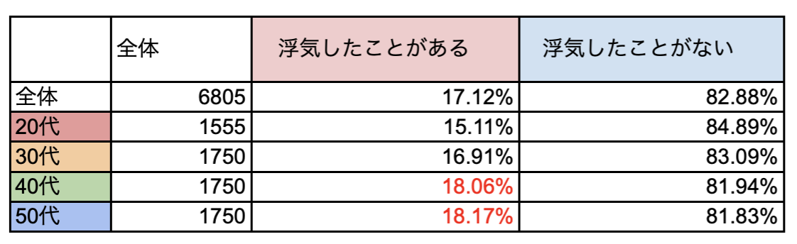 世代別に比較してみると、浮気率は年齢に比例して高くなる傾向で、40代50代はそれぞれ18%の人が浮気したことがあるという結果になりました。
