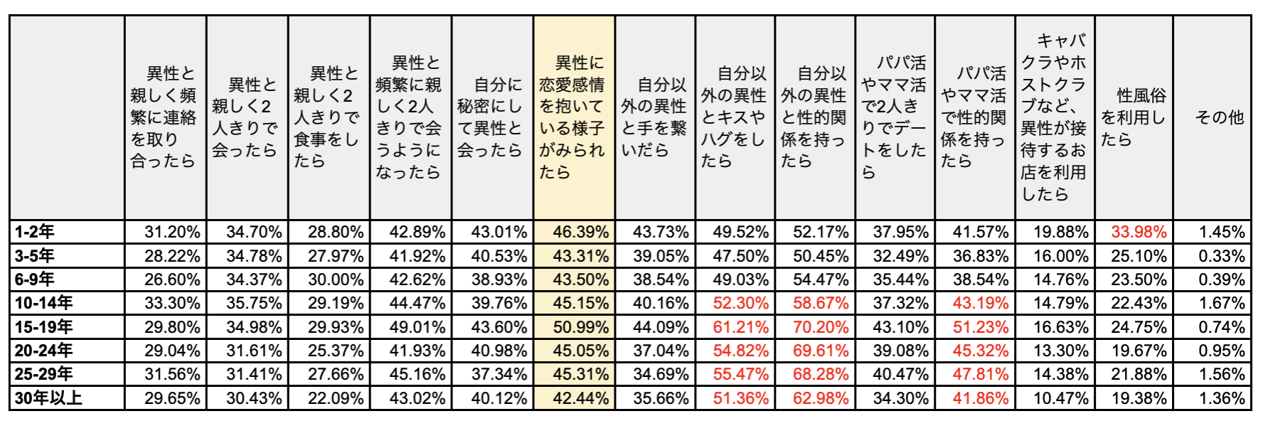また、結婚してから1-2年目の人は、「性風俗を利用したら」浮気と考える人が、結婚年数の長い人より多いことがわかりました。新婚時代は性風俗も許せないということでしょうか。