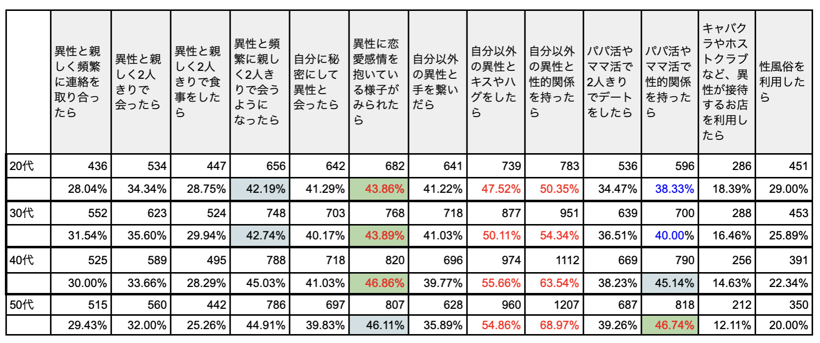 個々の選択肢の「浮気認定率」は予想よりも低い結果になりましたが、全体的な傾向を読み解くなら、性的接触や恋愛感情があれば浮気と考える人が多いと言えるでしょう。