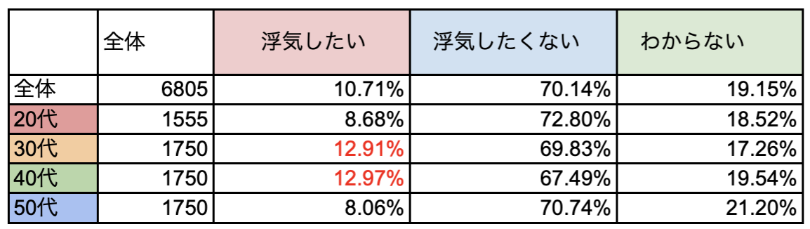 世代別に比較したところ、家庭や仕事での責任が重くなりがちでライフステージに変化が多い30代・40代のミドルエイジ層が最も「浮気したい」と考える傾向が高い様子が分かります。