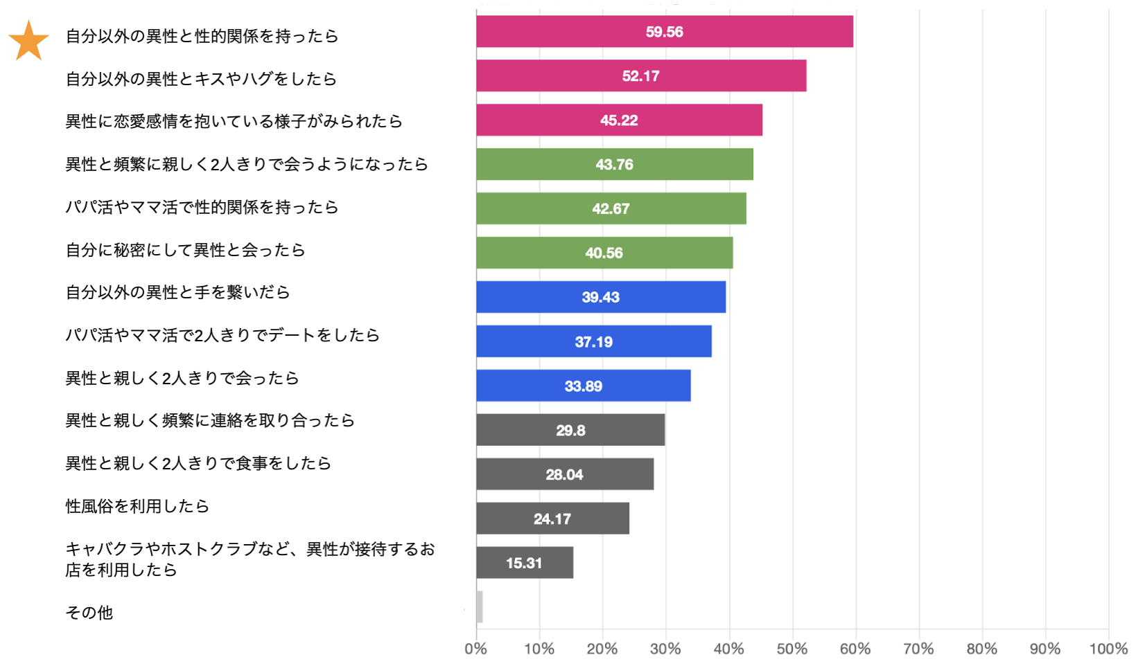 → 20代30代にとってはパパ活ママ活での性的関係より恋愛感情のあるスキンシップのほうが浮気と考える傾向