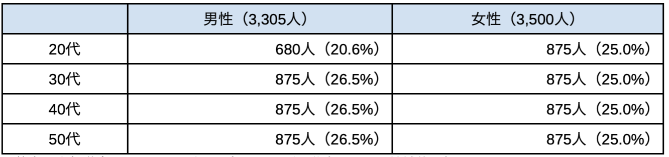下表の通り男女、各年代とも20代男性を除き均等なサンプルになっています。