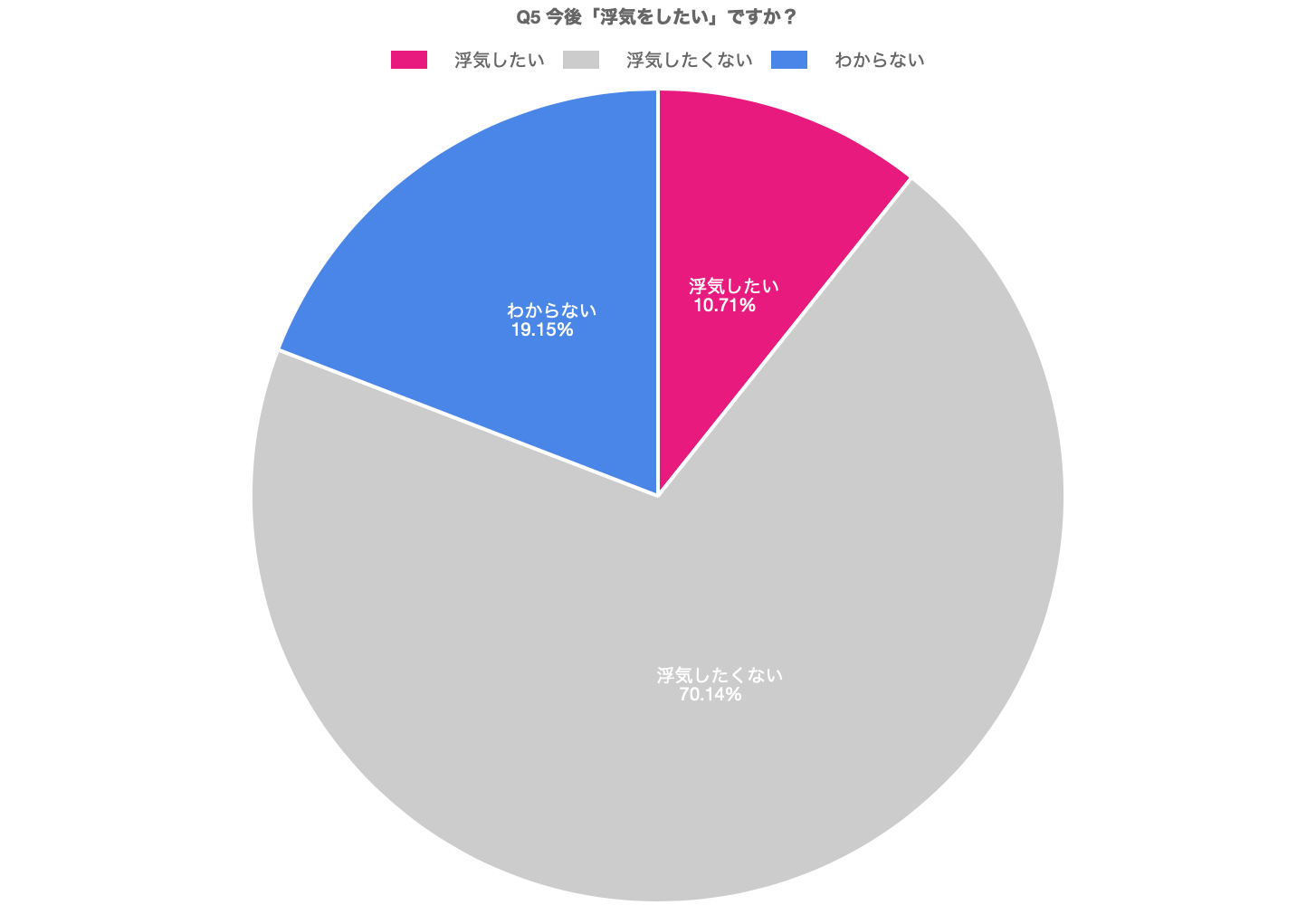 その結果、「浮気したい」と回答した人は11%程度でした。「わからない」と回答した人が19%程度いるものの、70%以上が「浮気したくない」と回答し、夫婦関係が良好な人が多いと示唆されます。
