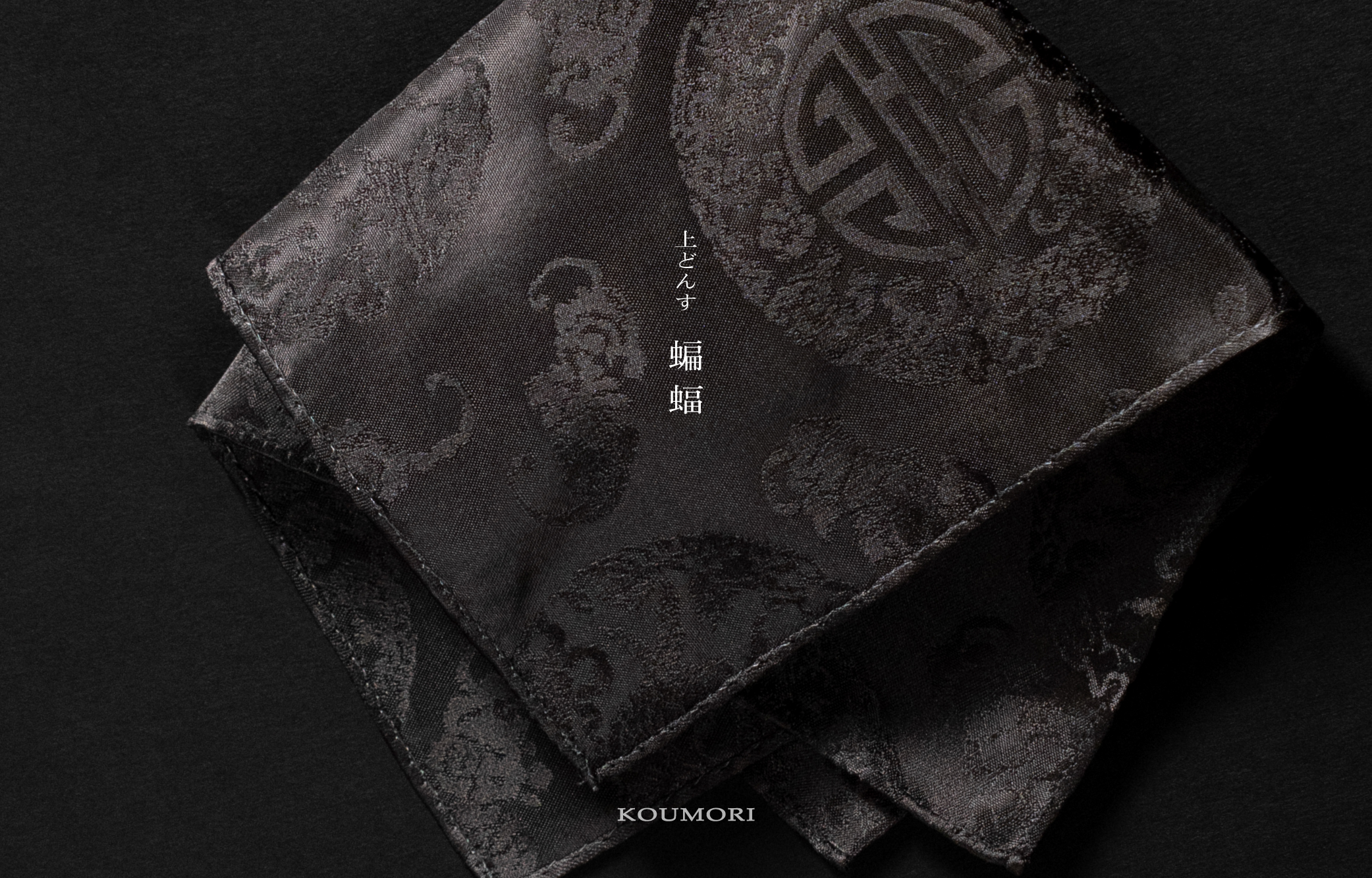 「福」と同音の蝠(こうもり)は、古来中国において幸福のしるしとされてきた吉祥文様です。音に託された福運と、夜を翔けるその姿が、しなやかで直感的な強さを象徴。利休が好んだ美しい鼠色で、控えめながらも個性光る一枚。