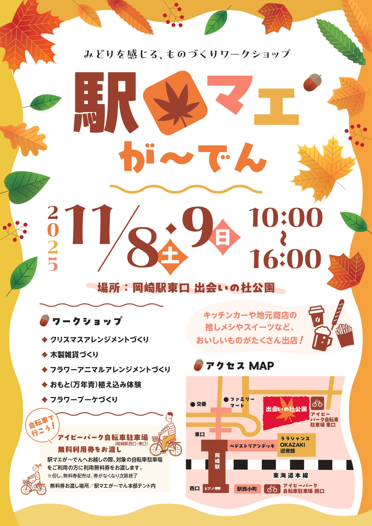 岡崎駅東口にある出会いの杜公園で、みどりを感じるものづくりワークショップ「駅マエ」が~でんを開催します。