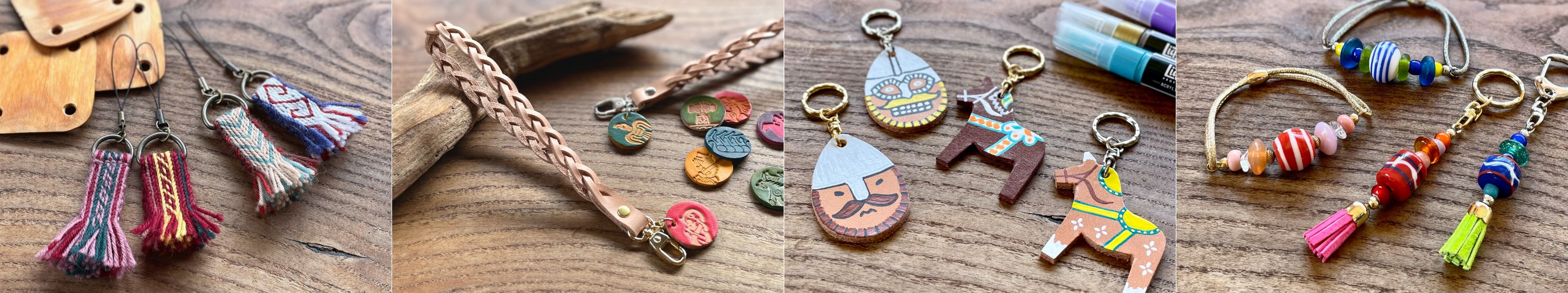 カラフルなヌメ革に好きな刻印を打って、自分だけのキーホルダー作り。