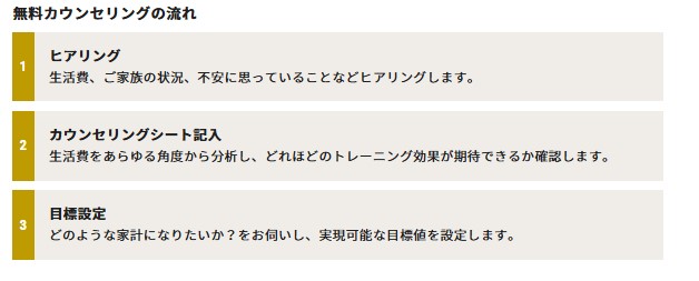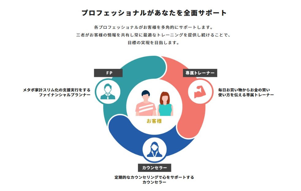 内容:カウンセリング・家計簿アプリ導入・専属FP/トレーナー/カウンセラーによるアドバイス提供