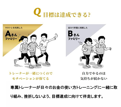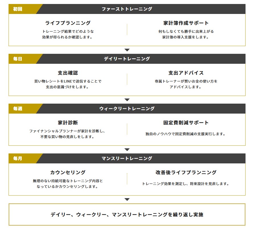 FP・専属トレーナー・カウンセラーが家計改善にむけて多角的にサポートします。デイリートレーニング・ウィークリーレーニング・マンスリートレーニングを繰り返すことで、支出における弱点を見つけて的確に改善していきます。