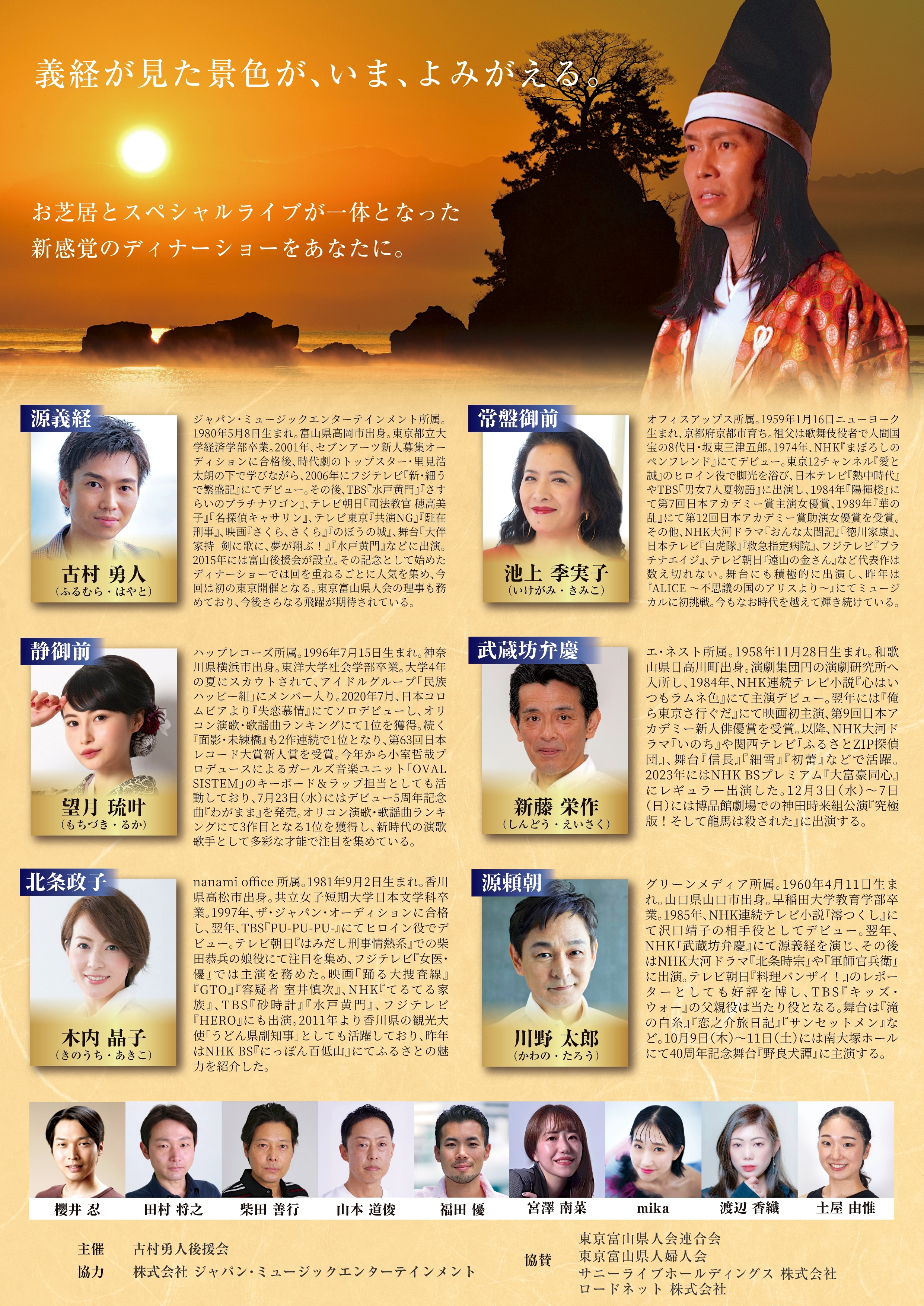 池上季実子、川野太郎ら実力派俳優と演歌歌手・望月琉叶が一日限りの共演。 源義経をめぐる壮大な戦国絵巻がザ・プリンスパークタワー東京に蘇ります。