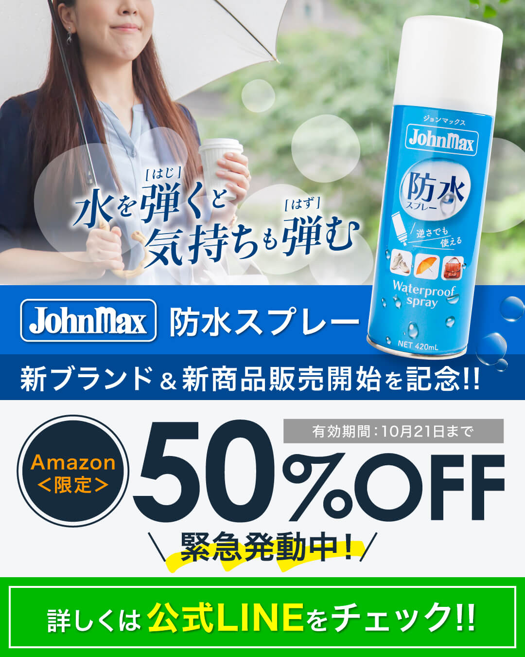 この度、株式会社ユニバーサル物産(所在地:愛知県名古屋市 代表取締役:林恭史)が今秋より開始する“日常の不快から「守る・防ぐ」”ことを掲げる新ブランド「Johnmax(ジョンマックス)」から、衣類や靴、革製品などを水や汚れから守る新商品 「Johnmax 防水スプレー」を2025年10月中旬より順次販売開始いたしました。新発売を記念してAmazonで新商品 「Johnmax 防水スプレー」の限定50%OFFキャンペーンを実施中です。(2025年10月21日(火)まで) キャンペーン詳細はジョンマックス公式LINEでご案内中です。