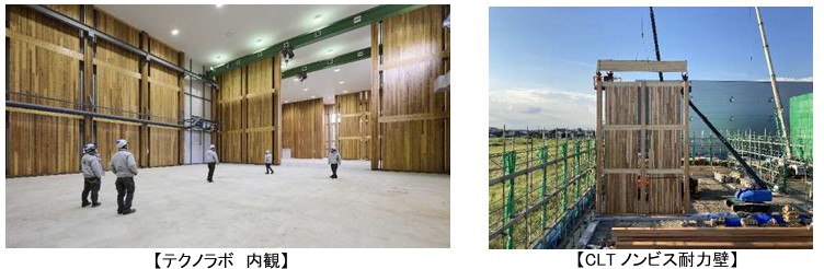 構造強度や耐震性能に関して、3階建ての住宅の実大実験まで可能な純木造の大型研究施設です。施工性と強度を両立した3 層CLT(直交集成版)を活用したノンビス工法耐力壁、経済性と強度を両立した高強度水平ブレース構造、運搬コストと大空間を両立した20m 繋ぎ梁を用いて、天井高さ約12m、広さ20m×52.5m という平屋の大空間を実現しました。平屋の店舗や倉庫・体育館等にも転用が可能で、中大規模木造建築の普及拡大に貢献します。