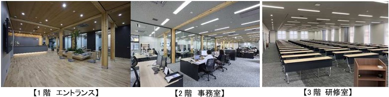3 階研修室は大断面集成梁120㎜×720㎜×12,000㎜をプレカットし、住宅用接合金物と組み合わせることで32m ×12m=384㎡の無柱空間を実現。1階と2階は柱・梁を6,000㎜以内に抑えて経済性と省施工を両立しています。