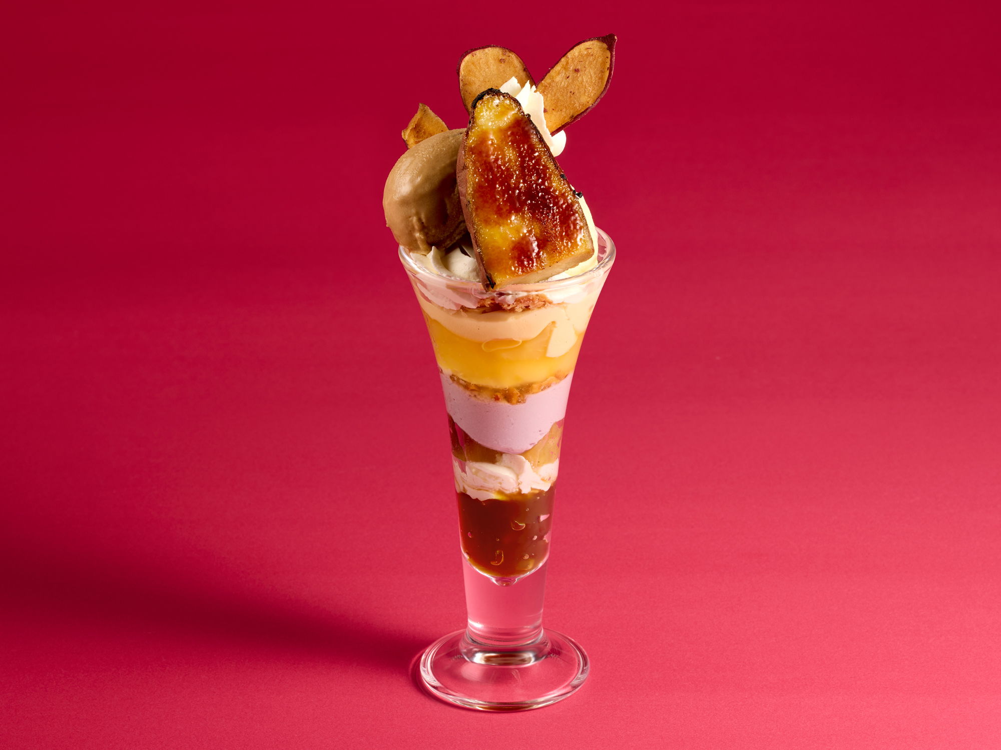 おいものモンブランをトッピングした、ミニサイズながらも満足感のあるパフェです。ねっとり甘いおいものペーストは、ホイップやバニラアイス、“紅はるか”の焼きいもと相性抜群。サクサクとしたクラッシュパイが食感にアクセントを加えます。