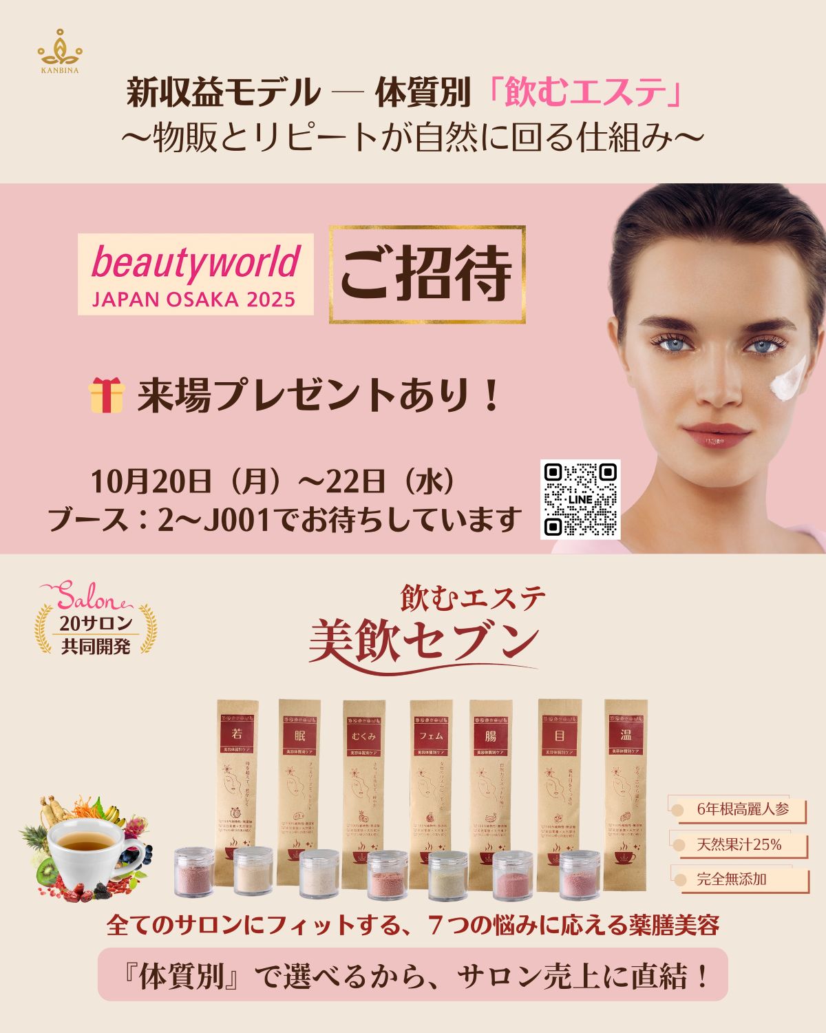 自然健康食品の製造・販売を行う日本HM株式会社(大阪市西成区、代表取締役:金田恵佳)が運営するKANBINAインナーケア研究所は、2025年10月20日(月)〜22日(水)にインテックス大阪で開催される「ビューティーワールド ジャパン 大阪 2025」にて、業界初の“体質別・施術専用ドリンク”『美飲セブン(ビンちゃん)』を出展いたします。