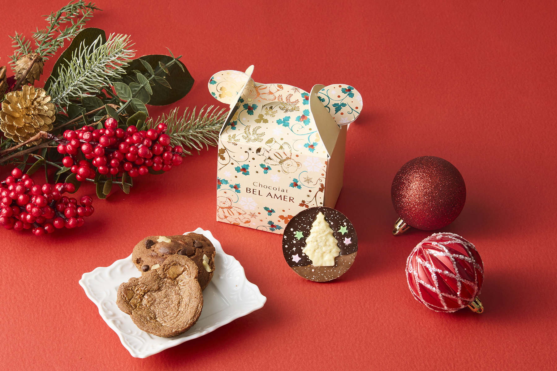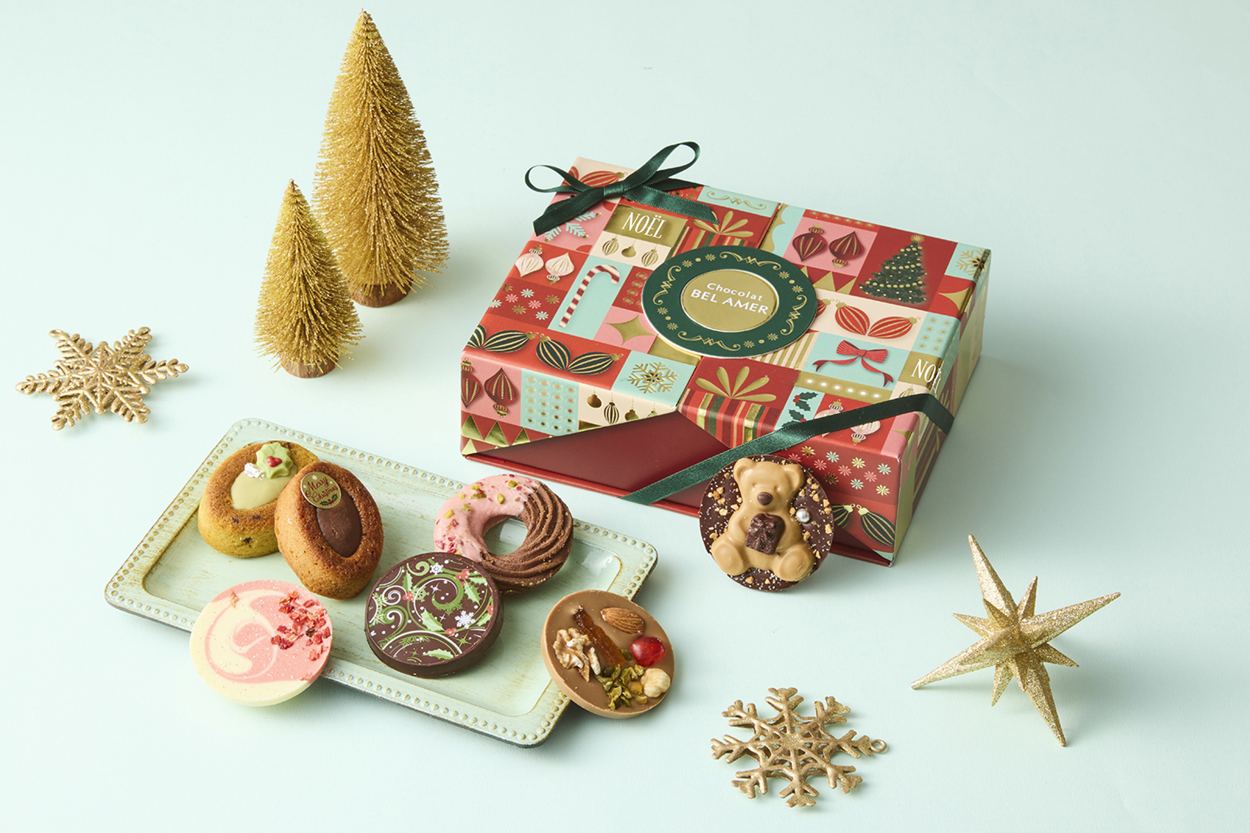 ショコラを使用したキュートなベア型の焼き菓子と、ベルアメールで人気のシグニチャー「パレショコラ」を詰め合わせました。クリスマス限定デザインのパレショコラには、ツリーや星などのモチーフがあしらわれ、見た目にも華やか。