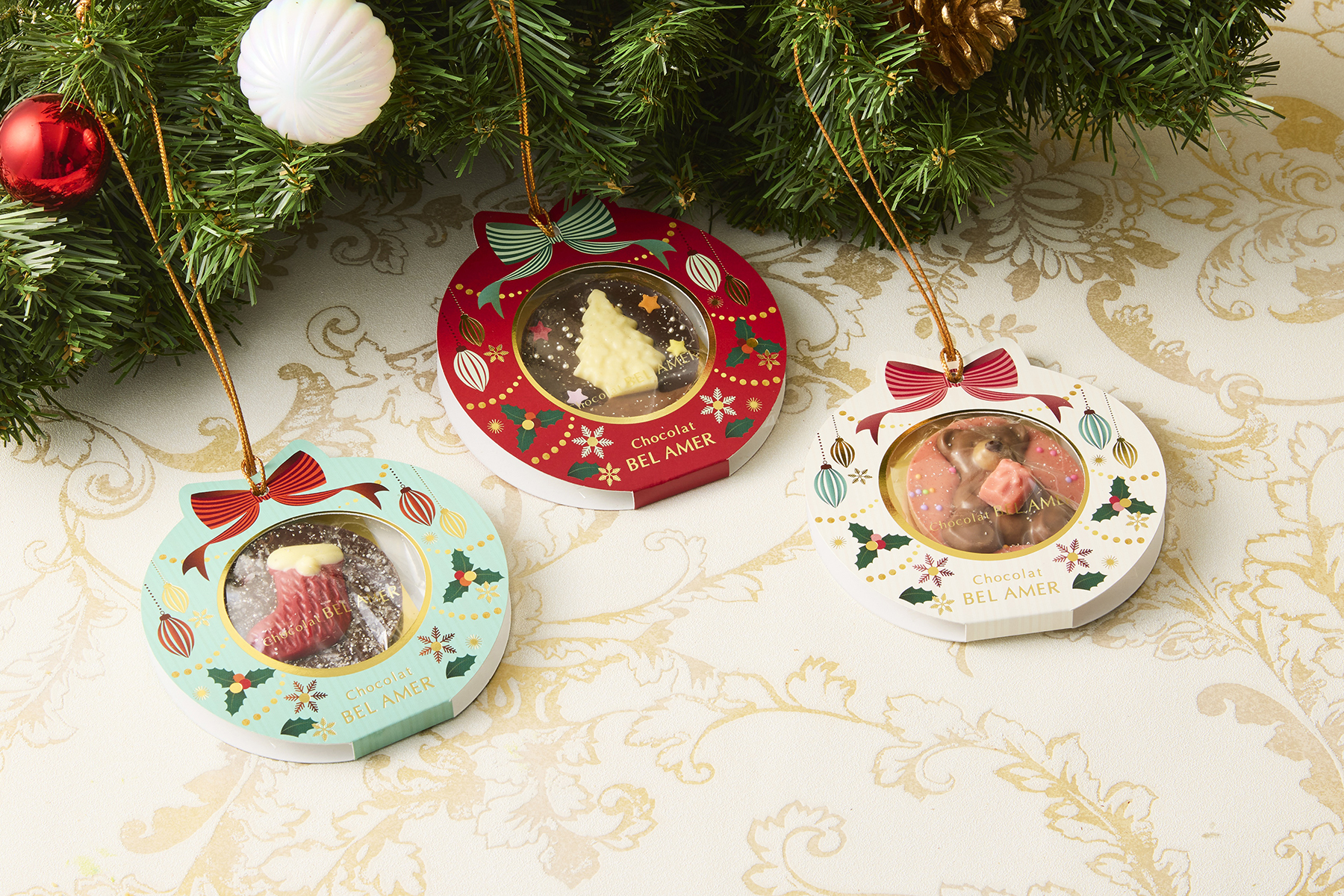 クリスマスツリーに飾って楽しめる、板チョコレートのオーナメント。
