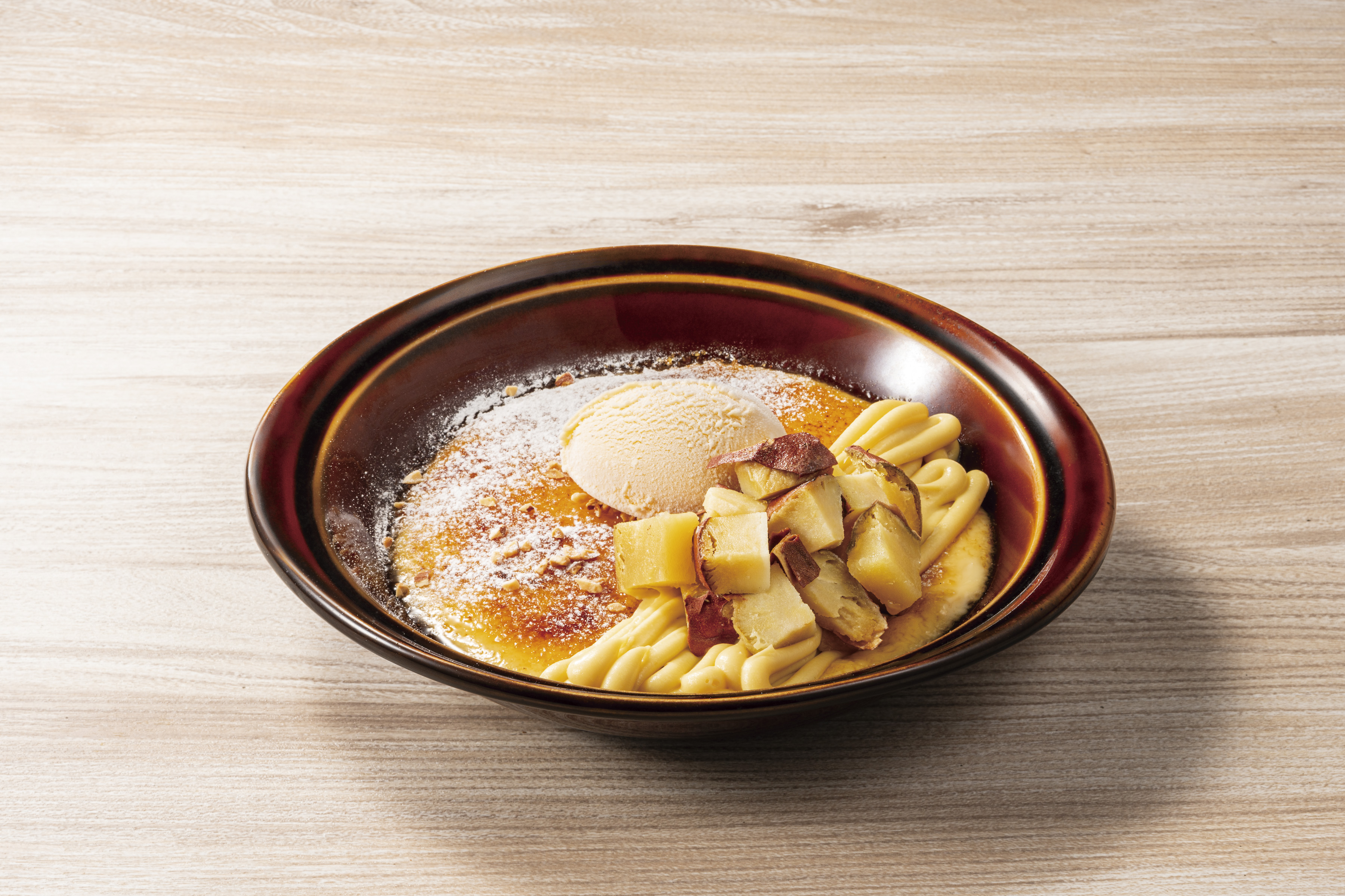 表面を香ばしくキャラメリゼした、ひんやりなめらかなデザート。『紅天使』の焼き芋やまろやかな安納芋ペーストをトッピングして、風味豊かに仕立てました。紅天使の焼き芋は、貯蔵庫等で熟成したさつまいもをじっくりと時間をかけて焼き上げているので、しっとりとした口あたりと濃厚な甘さが特徴です。カリッとしたキャラメルと、とろ〜りとしたクレームパティシエールの食感の違いも楽しみながら、蜜芋の味わいを存分にご堪能いただけます。