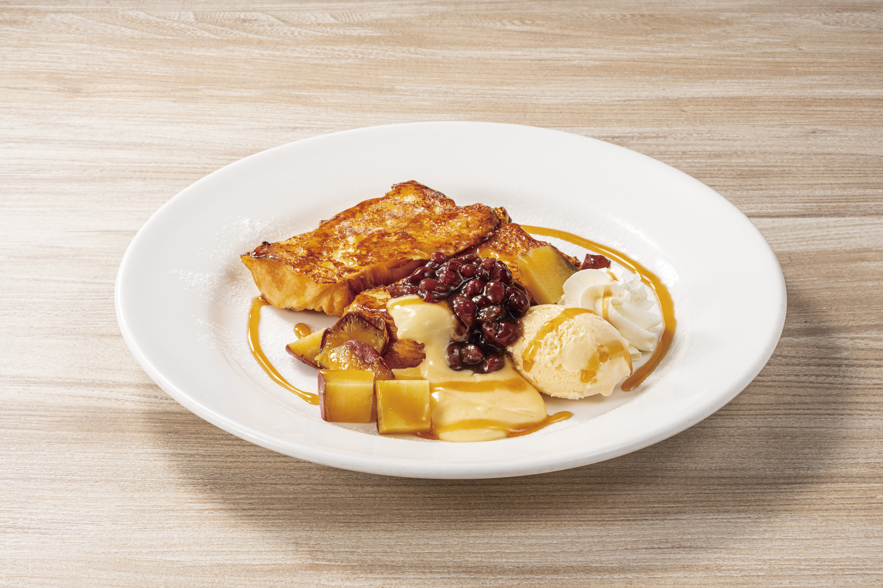 オーダーごとに焼き上げるフレンチトーストに、ゆであずきや『紅天使』の焼き芋をトッピング。まろやかなクレームパティシエールとみたらしソースを合わせて、和と洋の素材が調和した味わい豊かなデザートに仕立てました。温かい焼き芋やフレンチトーストに、ひんやり冷たいバニラアイスがベストマッチ! フレンチトーストや焼き芋に、クリーム、アイス、ソースをたっぷりつけて、あますことなくお楽しみください。