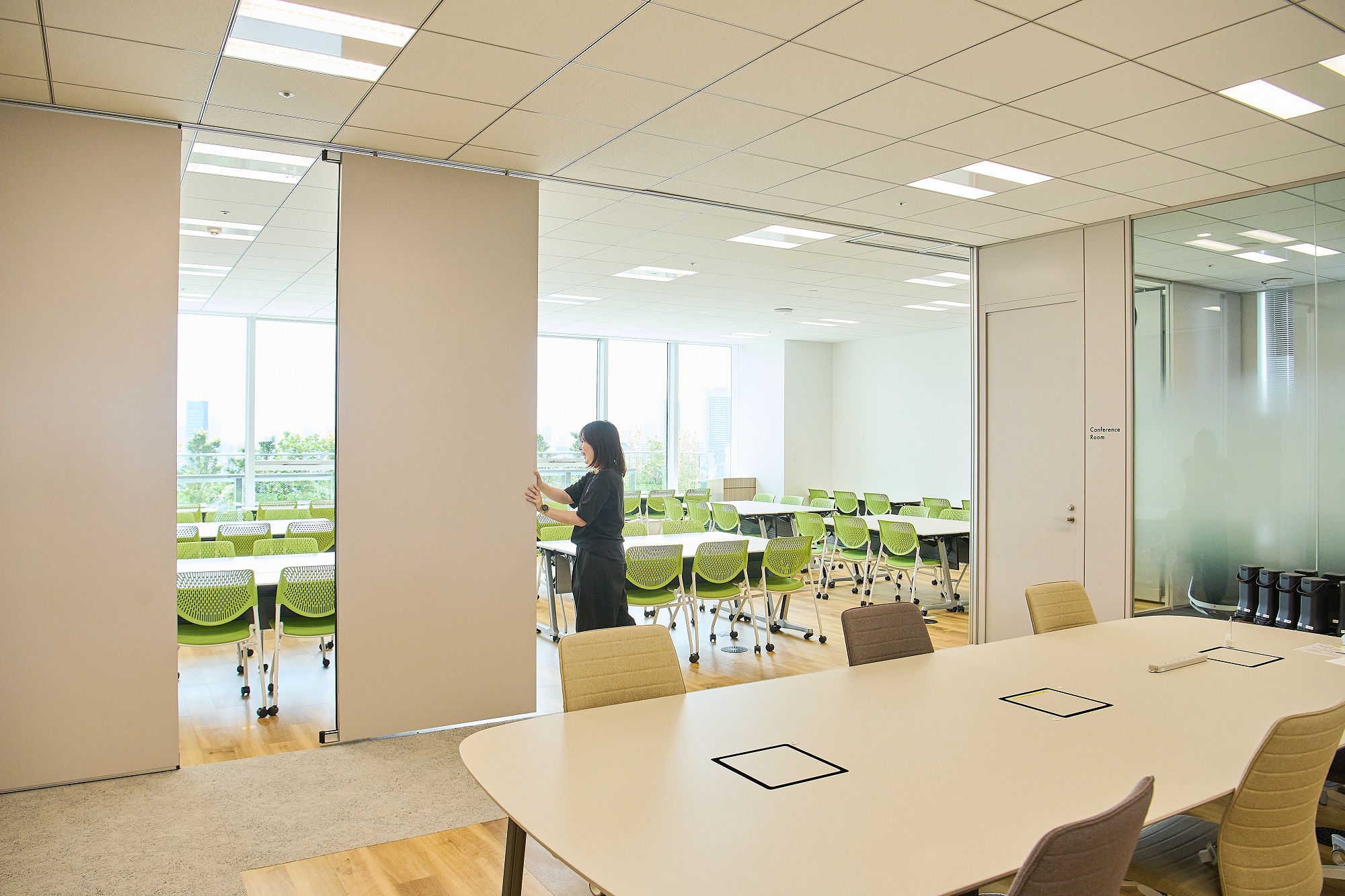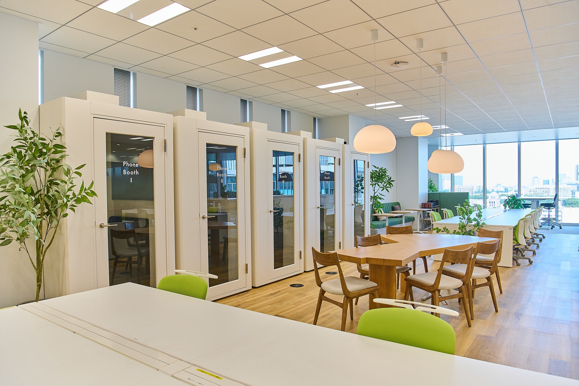 予約不要のコミュニケーション席では、気軽な打ち合わせや立ち話から新しいアイデアが生まれます。1人用フォンブースも設置しており、増加するオンライン会議にも対応。さらに、ワークスペースにはスライディングウォールを採用し、デスクワークスペースから大会議室への柔軟な切り替えが可能です。