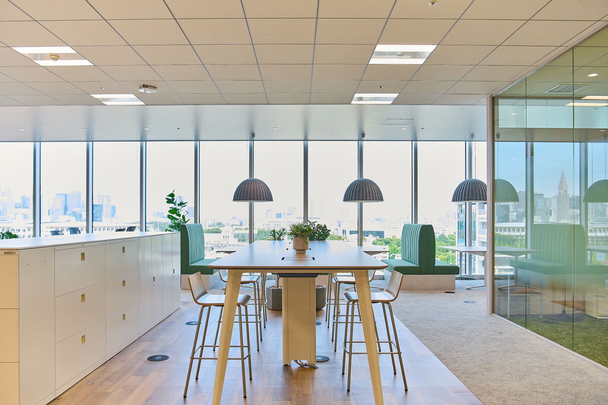 新オフィスは青山一丁目駅から徒歩2分、外苑前駅から徒歩5分の好立地で、周辺の美しいイチョウ並木など四季折々の景観も楽しめます。室内には植物を配置し、デスクワークスペースに加えて、ソファやテーブルを組み合わせた多目的なコミュニケーションスペースも設置。集中と交流の両立を可能にしています。