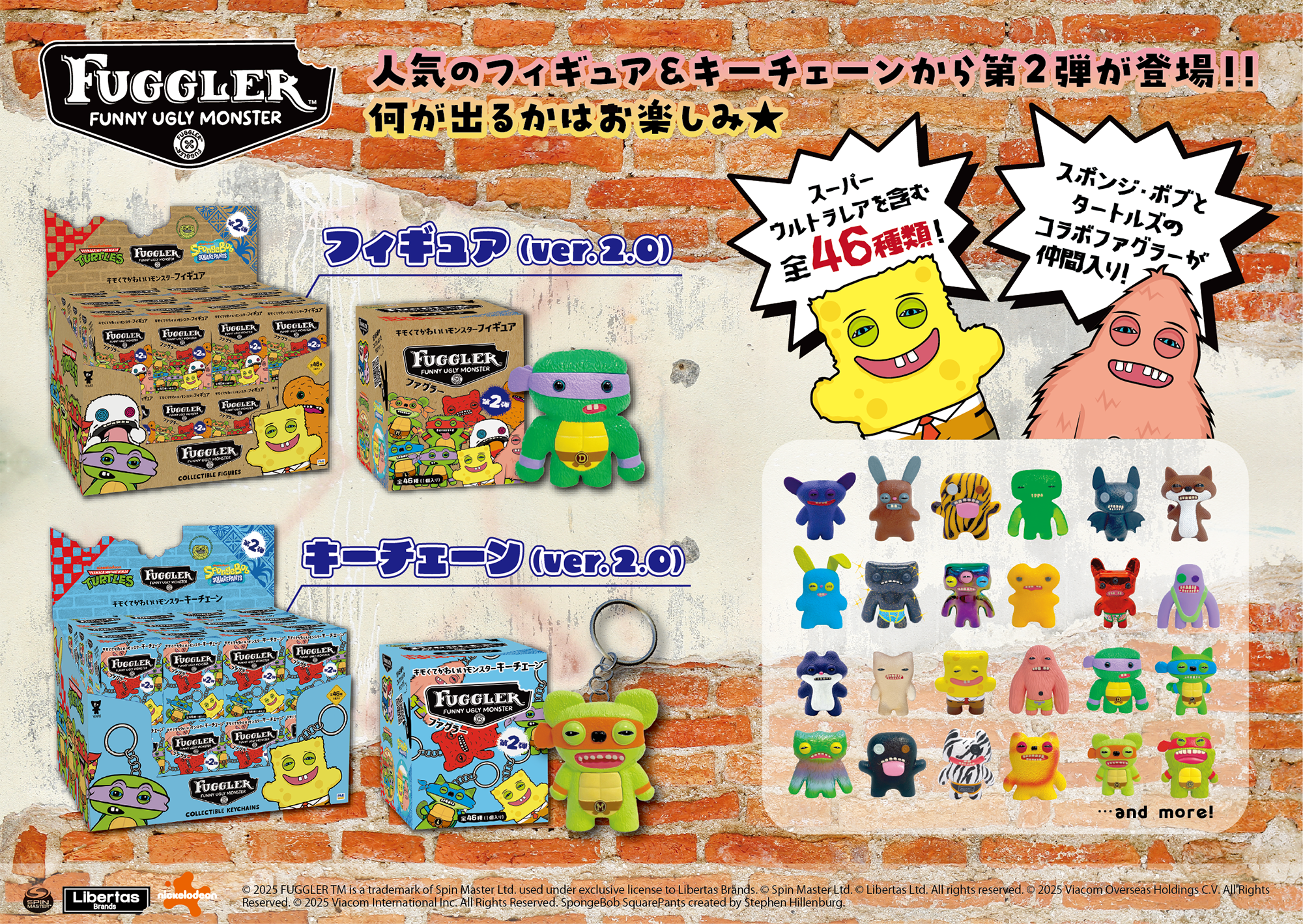世界中で話題沸騰中の“キモくてかわいい”モンスター「ファグラー」から、待望の新シリーズが登場! 「ファグラー フィギュア ミステリーボックス(ver.2.0)」と「ファグラー キーチェーン ミステリーボックス(ver.2.0)」を10/17より発売いたします。 今回はなんと「スポンジ・ボブ」や「ティーンエイジ・ミュータント・ニンジャ・タートルズ」とのスペシャルコラボも実現。全46種類のファグラーたちが再び世界を混乱に陥れる!?