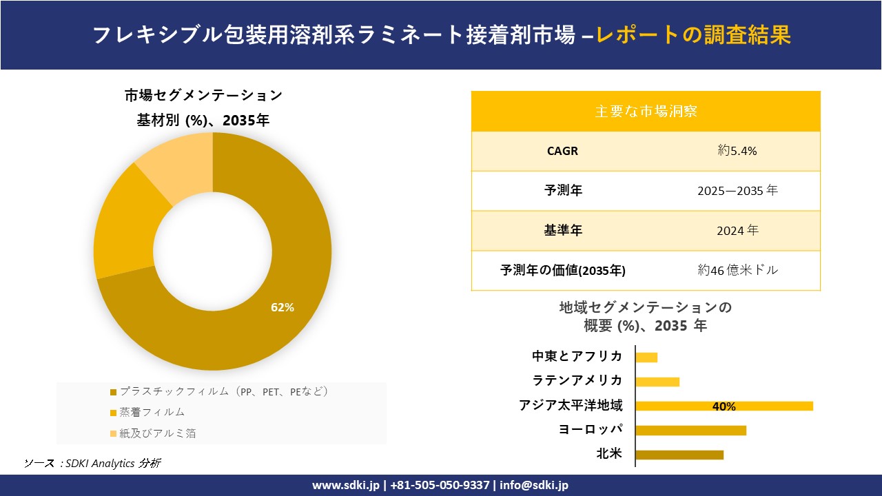 東京都渋谷区、2025年10月13:SDKI Analyticsはこのほど、「 フレキシブル包装用溶剤系ラミネート接着剤市場に関する調査レポート : 予測2025―2035年」を発行しました。調査レポートは、 フレキシブル包装用溶剤系ラミネート接着剤市場の成長に貢献する統計的及び分析的アプローチに焦点を当てています。当社の読者は、現在の市場シナリオに関する明確なイメージを得るとともに、詳細な調査レポートで提供される主要な業界の洞察から将来の傾向についても理解します。フレキシブル包装用溶剤系ラミネート接着剤市場に関するこの調査レポートは、一次調査方法と二次調査方法の両方を利用して、市場の成長に伴う現在及び将来の市場動向を分析します。