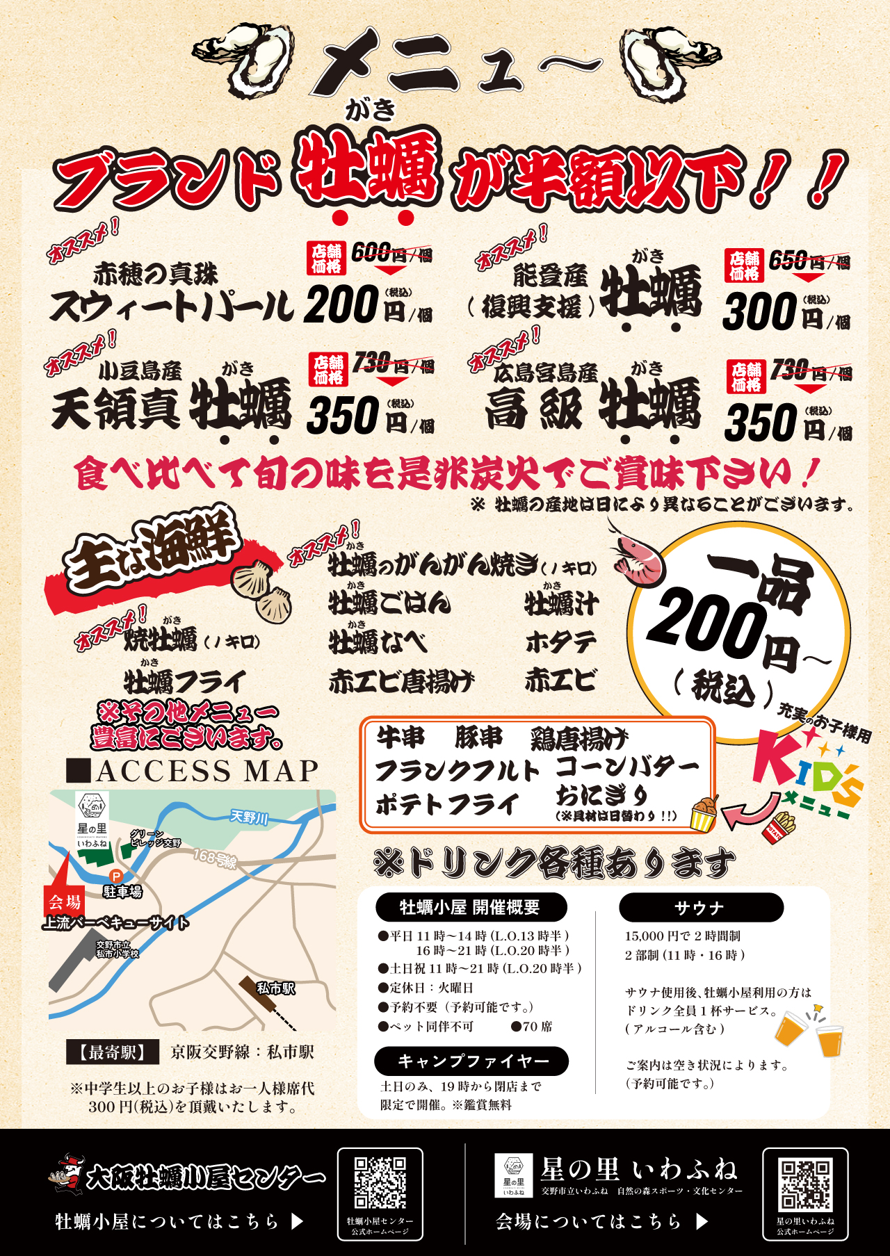交野市に初登場‼ 地域の自然と食の魅力を存分に楽しめる、 冬季限定の「本格炭火BBQスタイル牡蠣小屋」が、 2025年11月15日(土)~12月27日(土)まで【星の里いわふね】にOPEN‼