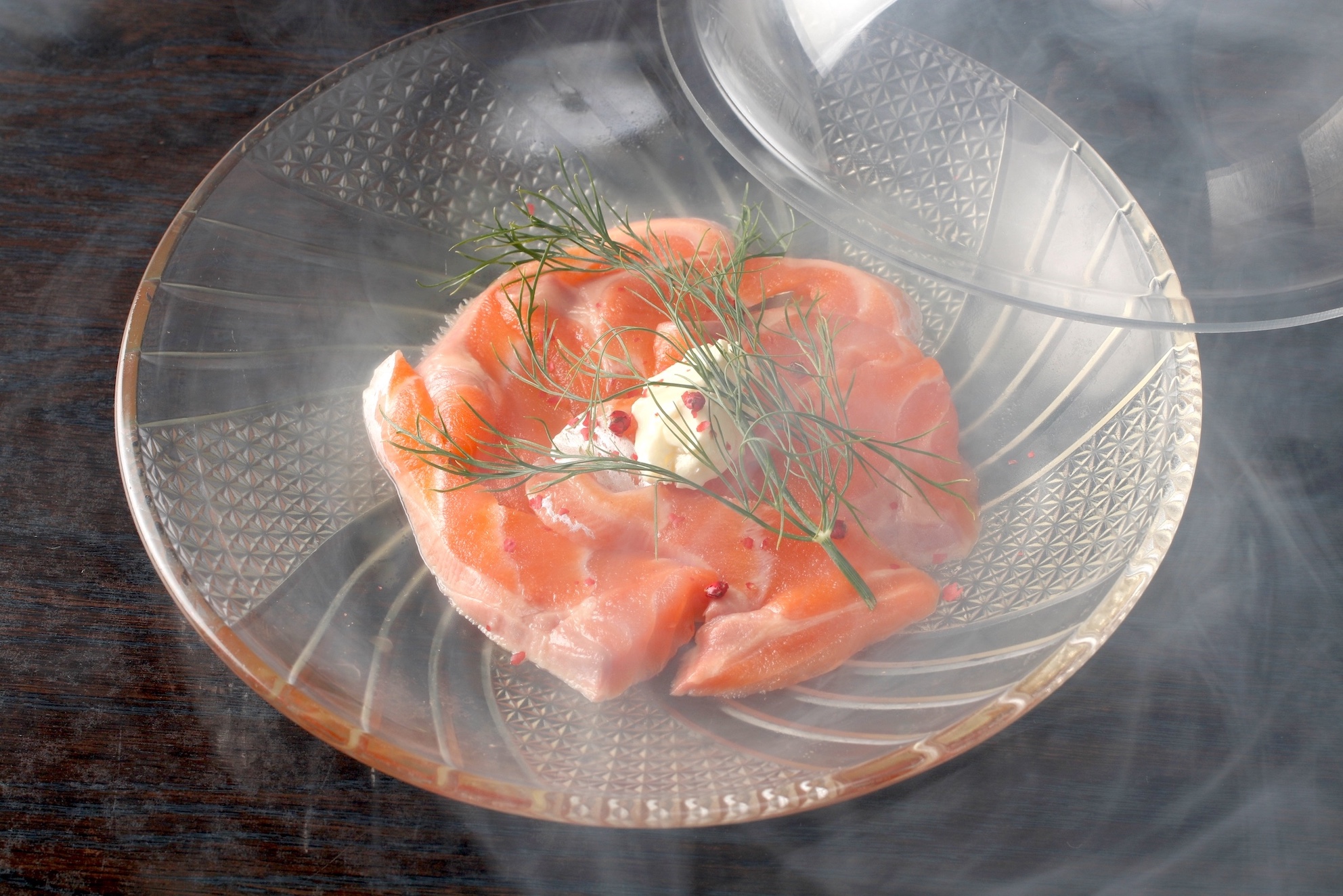 【熱々の鉄板焼き、⾹り豊かな燻製料理も︕】
