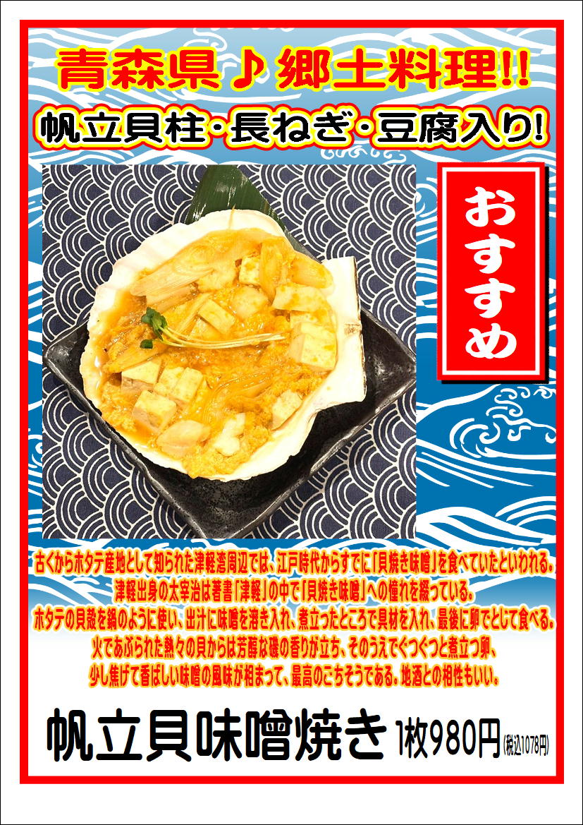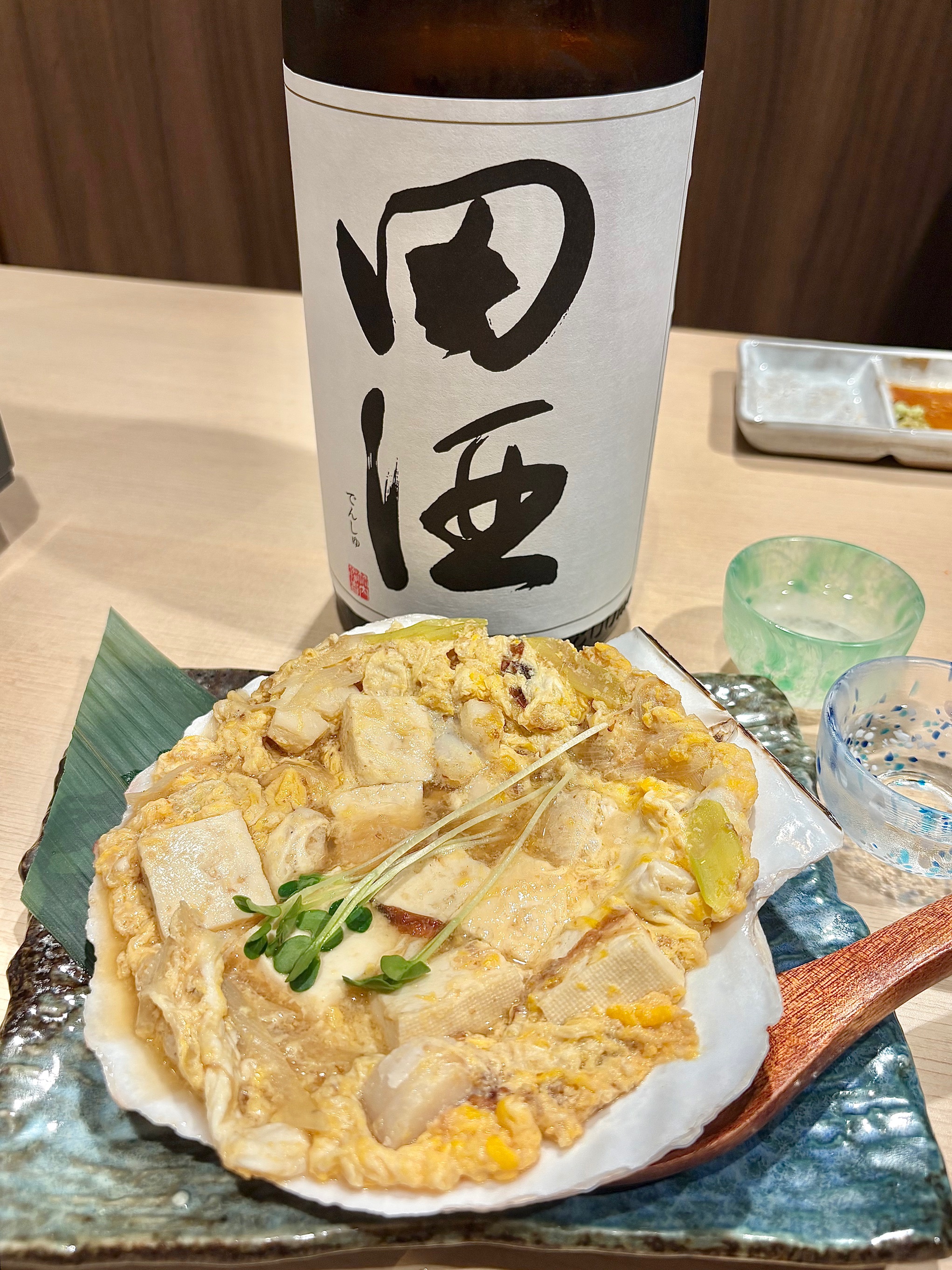 期間限定の「帆⽴⾙味噌焼き」、⻘森の地酒「⽥酒」とともに
