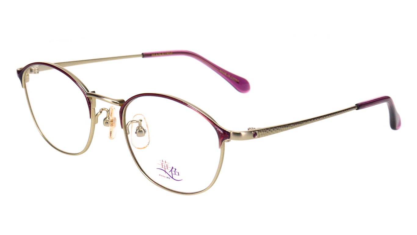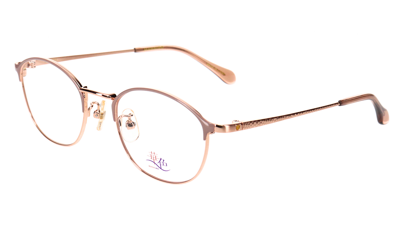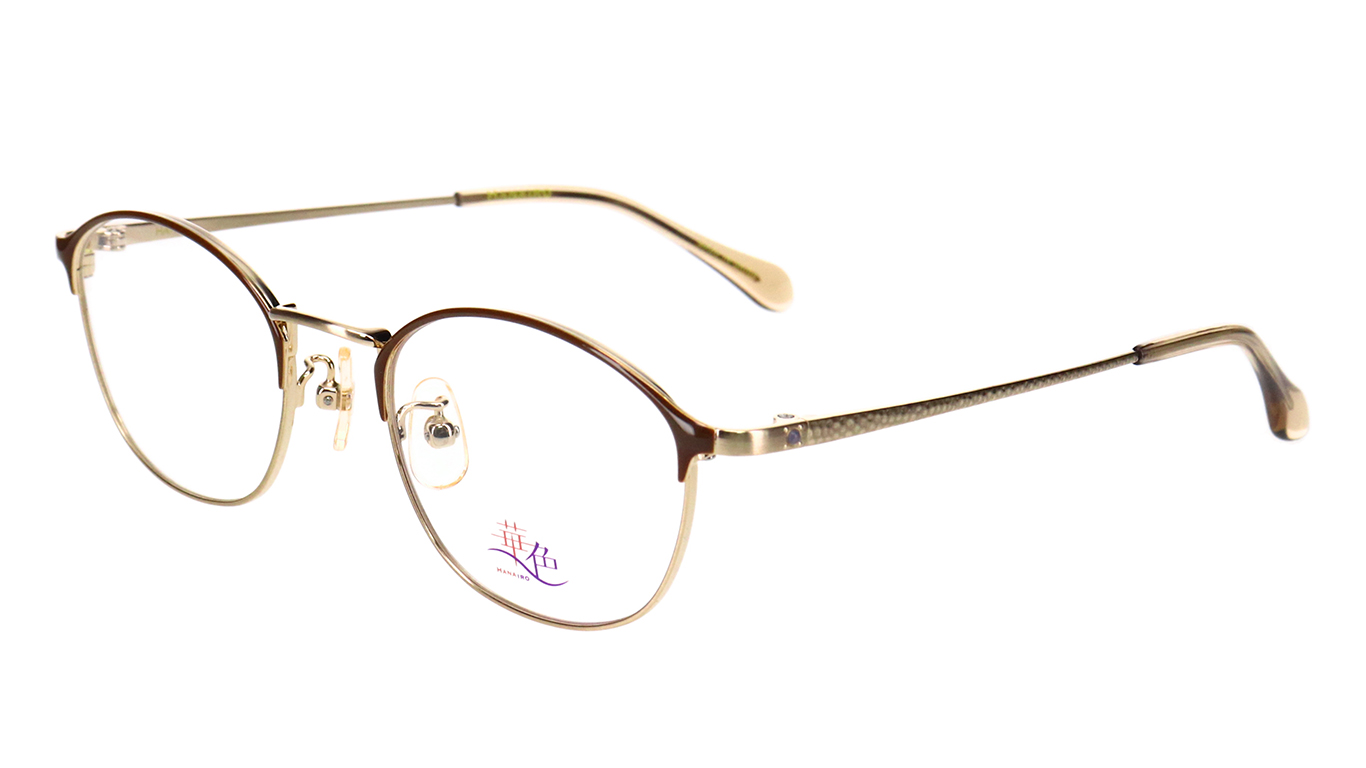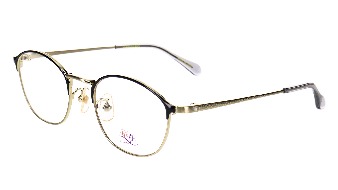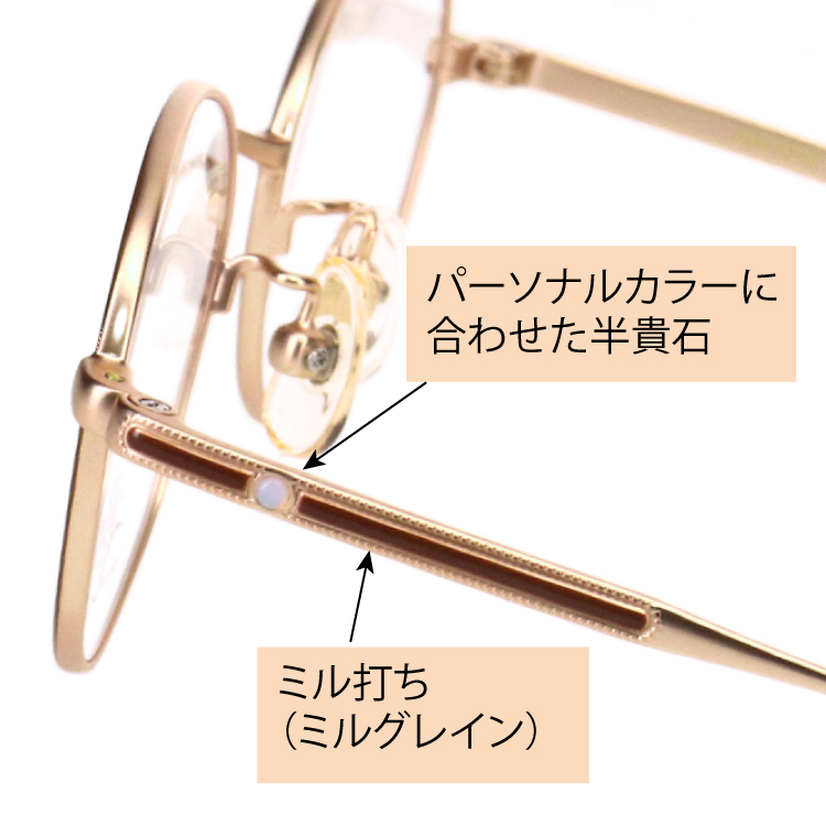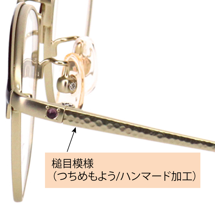 女性フレームで人気が高まっているブロータイプ(ボストン型)を採用。ブローのラインを極力細くし、リム線と自然に繋がる華奢なデザインにより、女性らしく使いやすいのが特徴です。テンプルには槌目模様を施し、合口近くに一粒の半貴石を配置しました。繊細な槌目模様が柔らかい輝きを放ちます。