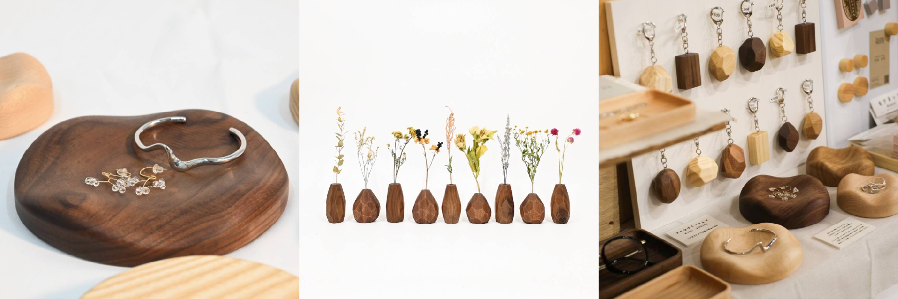 今回は木の端材から作った一輪挿し、アクセサリートレイ、キーホルダー、マグネットなどを販売します。