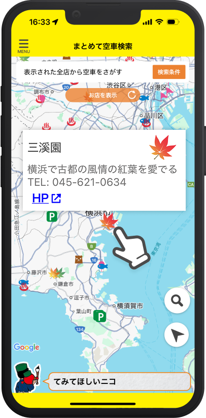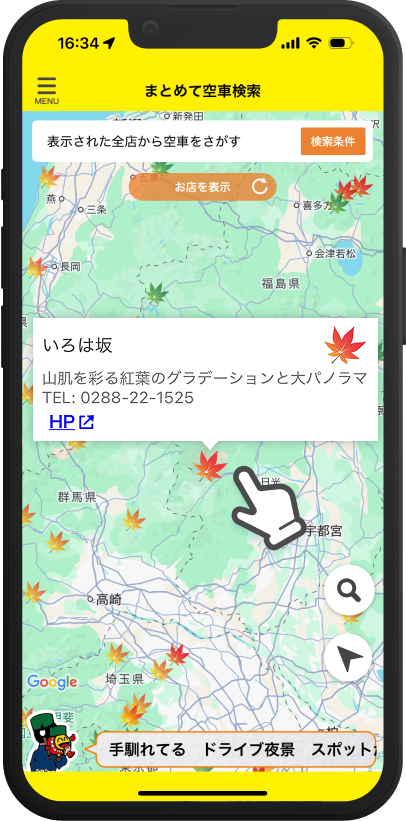 また、マップ上に表示される葉っぱのアイコンは紅葉スポットの位置を示しており、タッチすると各紅葉スポットの情報を確認することが可能です。