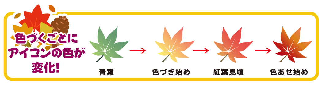 今秋も紅葉状況に合わせてアイコンの色が「青葉、色づき始め、紅葉見頃、色あせ始め」の4段階に変化し、秋が深まるほどに「ニコパス」も赤く染まるなど紅葉状況が一目でわかります。