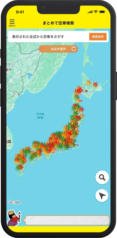 ご希望エリアで複数店舗の空車をまとめて検索できます。
