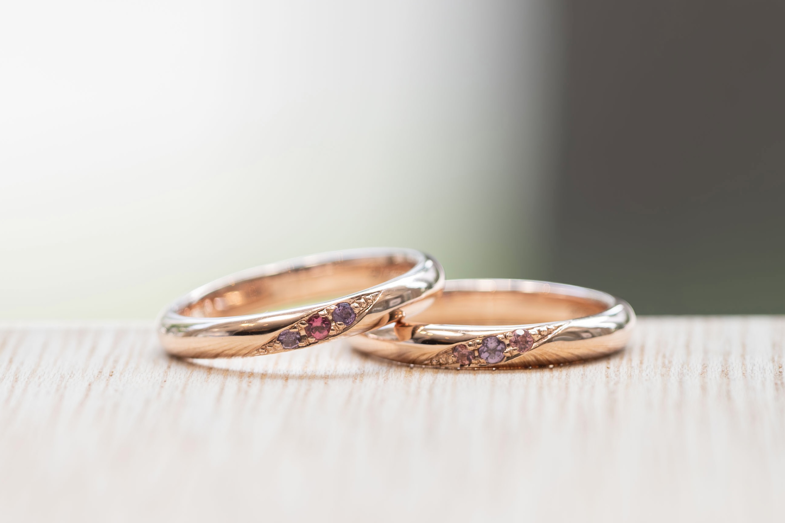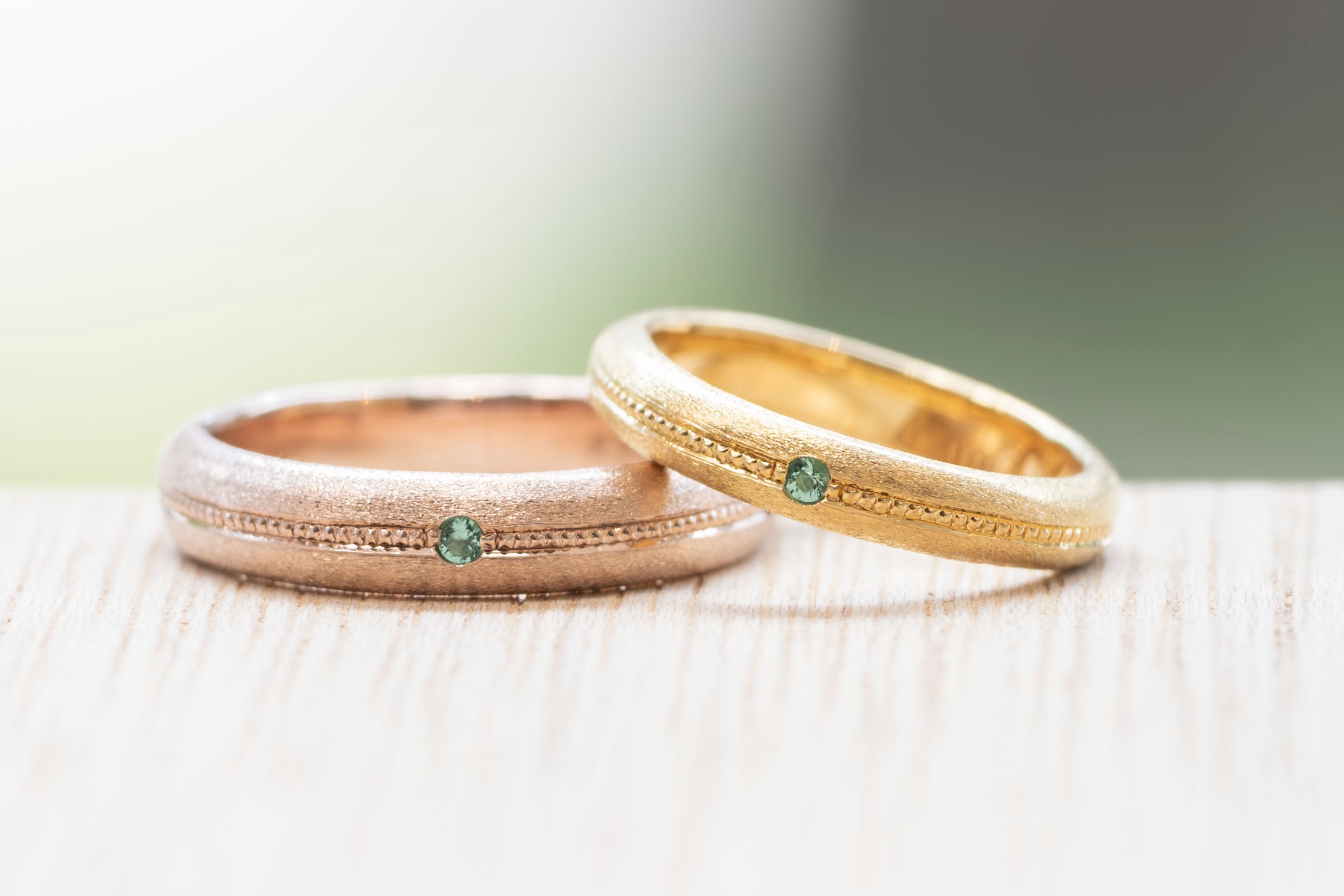 お互いの誕生石やお守りとしての意味付けに加え、トレンドの「推しカラー」を取り入れたいというニーズも引き続き見られます。一粒の宝石でリングの表情が大きく変わるのが魅力です。