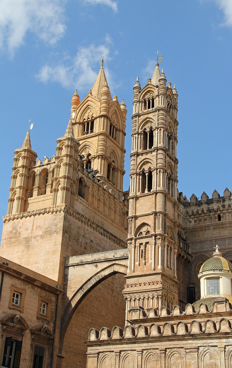 パレルモの街には、アラブ=ノルマン様式の建築群が並び、黄金のモザイクが輝く大聖堂やマルトラーナ教会などが世界遺産に登録されています。市場に足を踏み入れれば、香辛料や魚介の香りに包まれ、シチリアらしい生命力を感じられます。