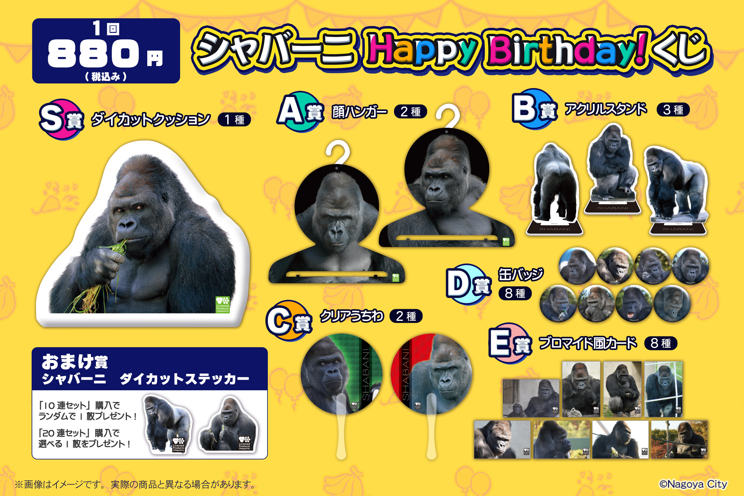「シャバーニ Happy Birthday! くじ」は、10月20日(月)に誕生日を迎える、東山動植物園の「イケメンゴリラ」として有名な「シャバーニ」の誕生日を迎えることをお祝いするもので、フォトビジュアルを使用した「ダイカットクッション」や「顔ハンガー」、「アクリルスタンド」などが賞品となっています。