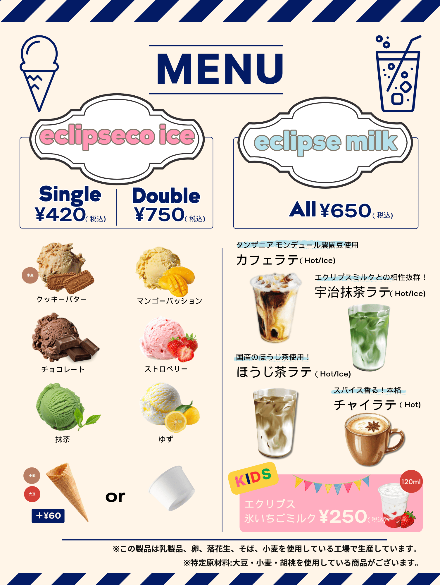 本ポップアップは、“プラントベースでありながらリッチでクリーミー”なエクリプス ミルクの魅力をより多くの方に体験いただくことを目的としています。バリスタやシェフとのコラボレーションでメニュー開発したカフェラテやチャイラテ、抹茶やほうじ茶を使った和テイストのドリンクを提供します。さらに、昨年同時期に開催したポップアップで大好評だった濃厚な植物性アイスもフレーバーを6種類に増やして販売します。大人から子どもまで楽しめるラインナップをご用意しています。