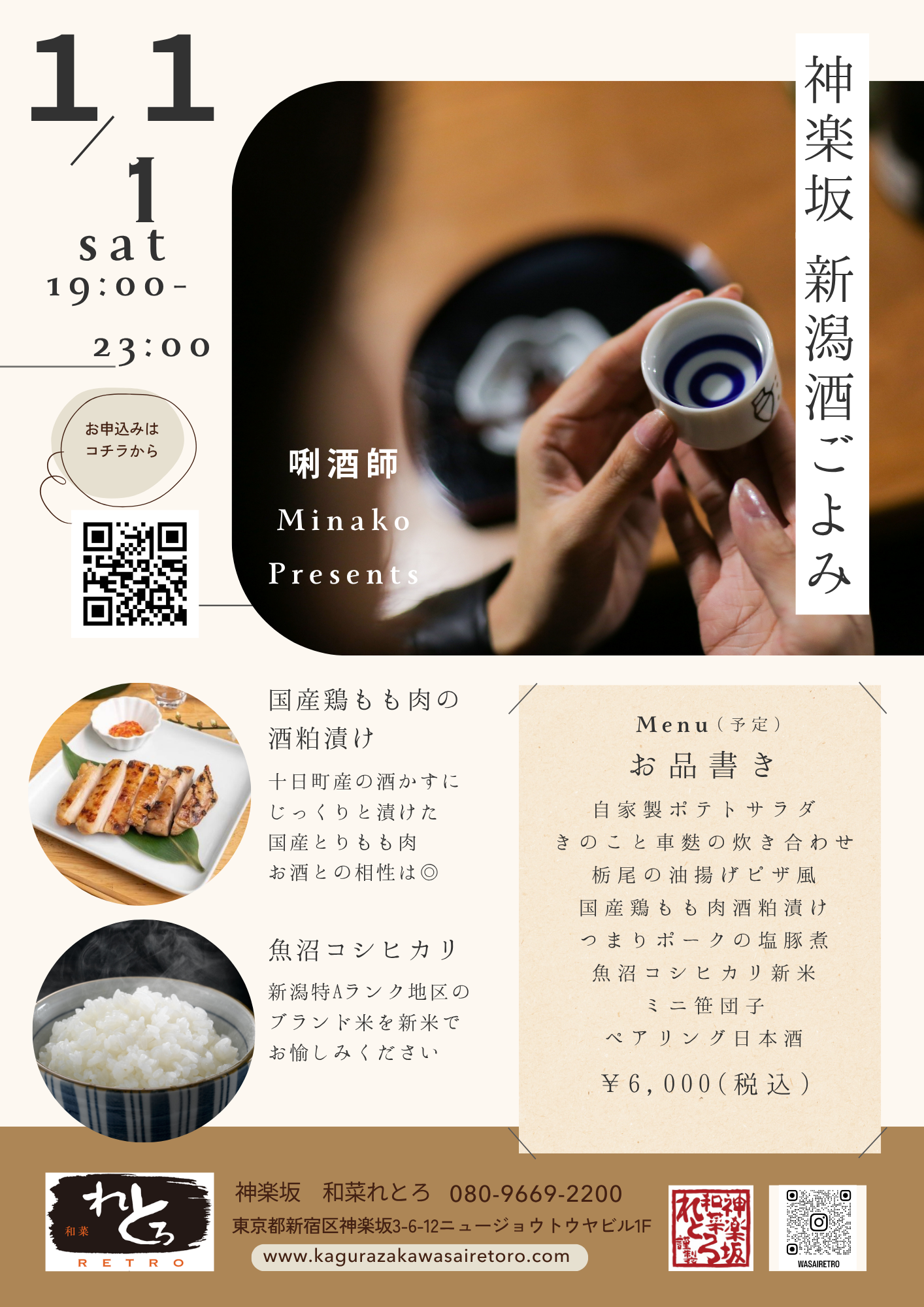 11/1(土)19:00~23:00 神楽坂和菜れとろにて \当店の唎酒師minakoが選ぶお酒を楽しむ会/ 『神楽坂新潟酒ごよみ』を開催します!