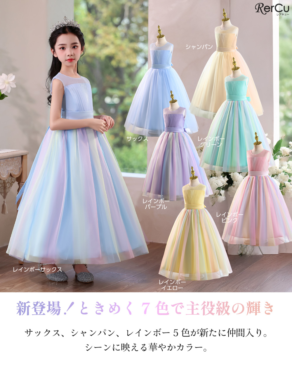 子供用フォーマルドレスを展開する「RerCu」ブランドの中でも、上品なシルエットと軽やかな着心地で人気を集めている「ky006 ロング丈チュールドレス」。これまで単色のみのラインアップでしたが、このたび、虹色のグラデーションが美しい“レインボーチュールタイプ”5色と、新たな単色2色を加えた計7色の新色を発表いたしました。