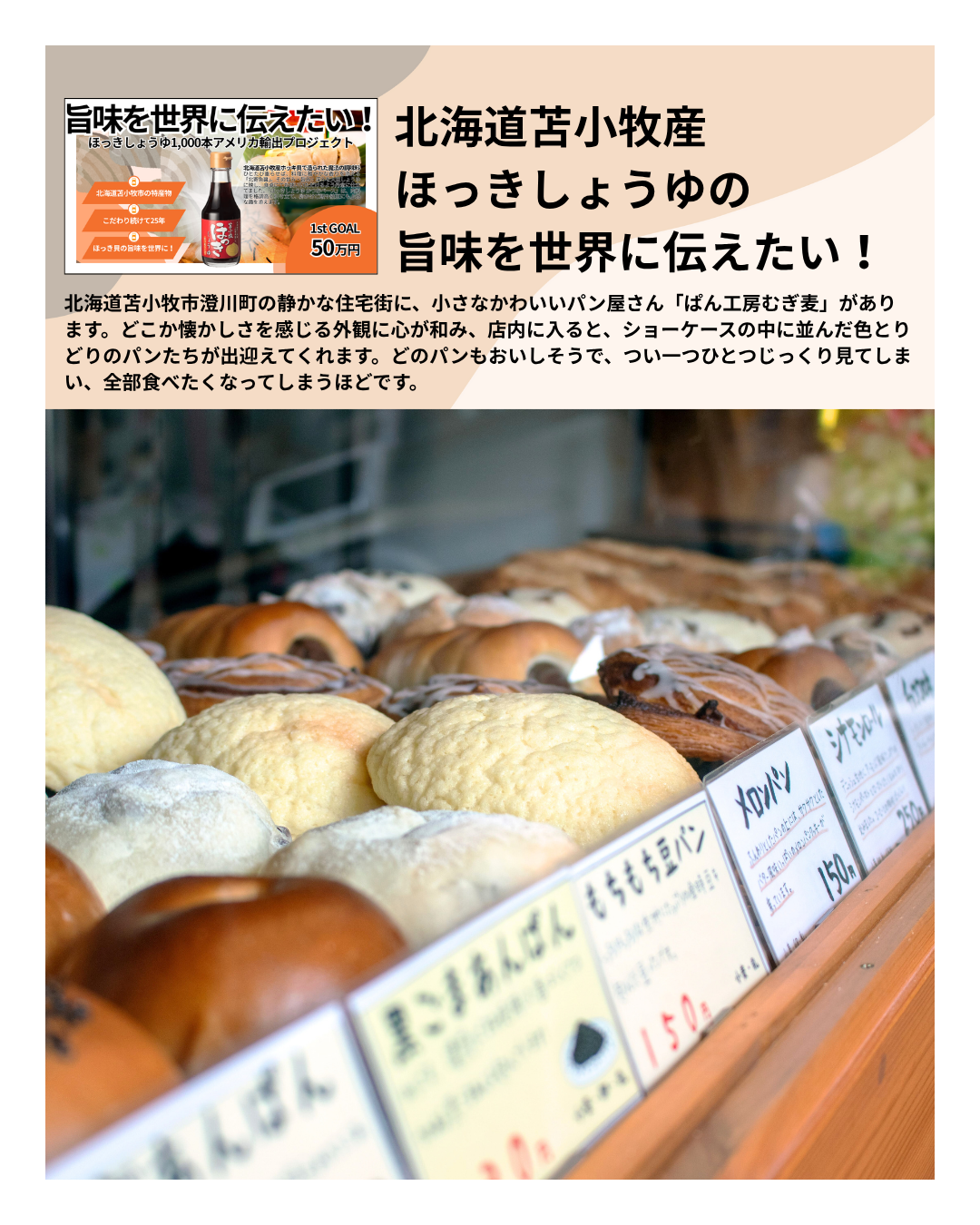 北海道苫小牧市の特産物である北寄(ほっき)貝で造った「ほっきしょうゆ」1,000本をアメリカ輸出するプロジェクト。甘み・旨み・深みで、美味しいをもっと豊かにしたい!そして、100年先の未来、世界のキッチンで当たり前に使われる北寄魚醤文化の普及を目指します!