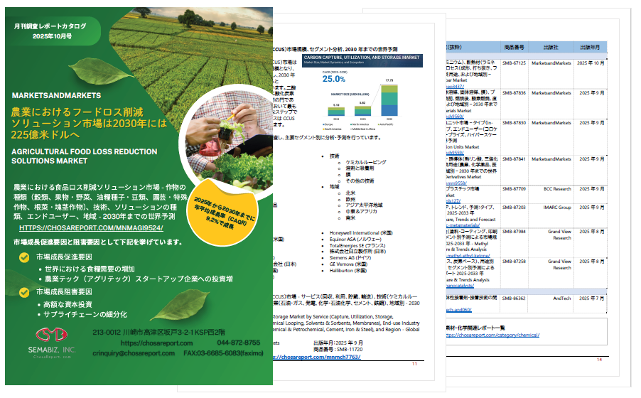 SEMABIZは調査レポートの総合カタログ「月刊調査レポートカタログ」2025年10月号のオンライン配布を開始しました。月刊調査レポートカタログは特にお問合せやご注文の多い分野を中心に関連レポートをまとめています。