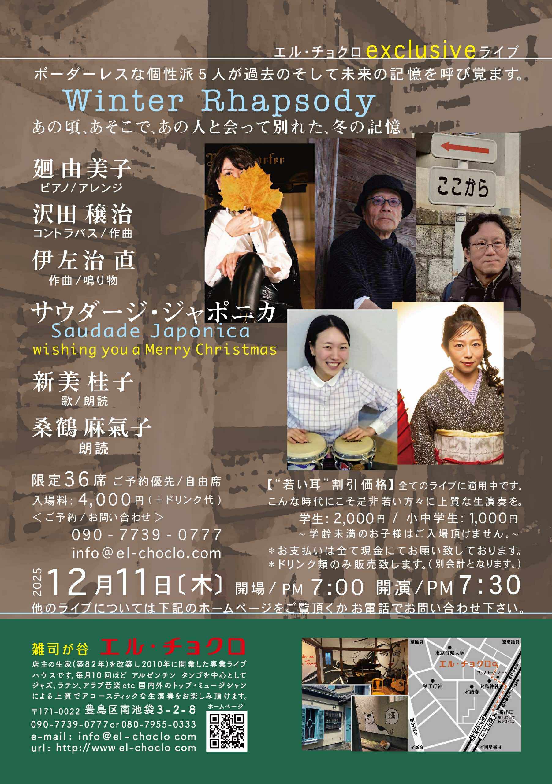 多方面で活躍する個性派5人によるシリーズ第六弾(エル・チョクロ企画としてはvol.5)は、過去のそして未来の記憶を呼び覚ます "冬" のサウダージをお届け!詩を織り交ぜたオリジナルからアレンジ曲まで、朗読と音楽が融け合う、マジカル・ミステリー・ツアーへと誘います。(※限定36席)