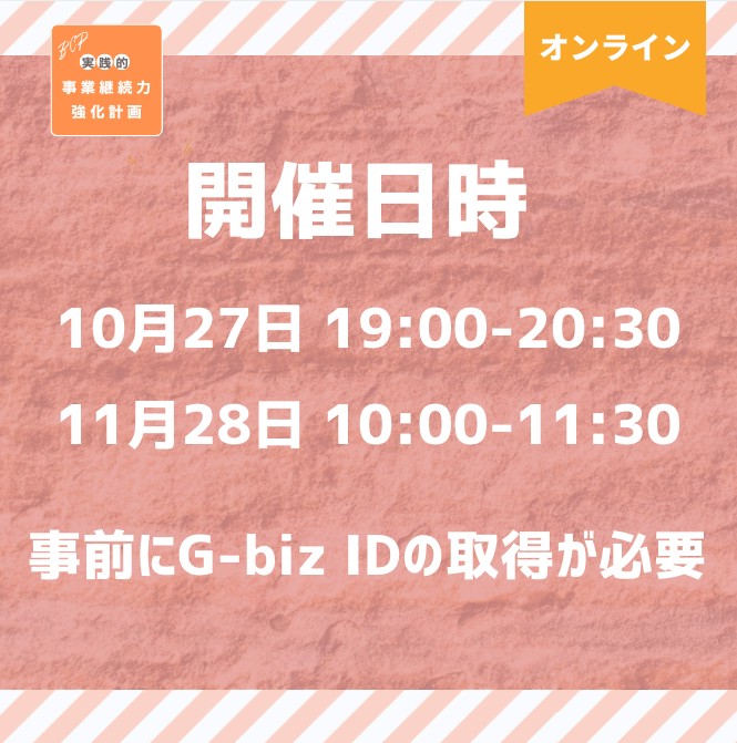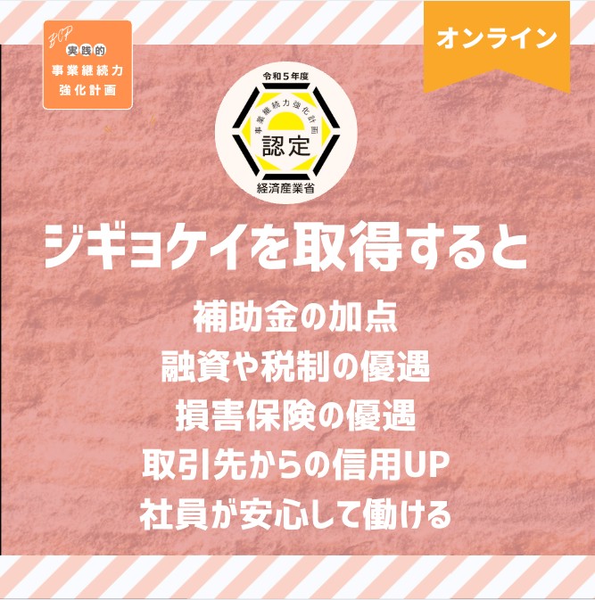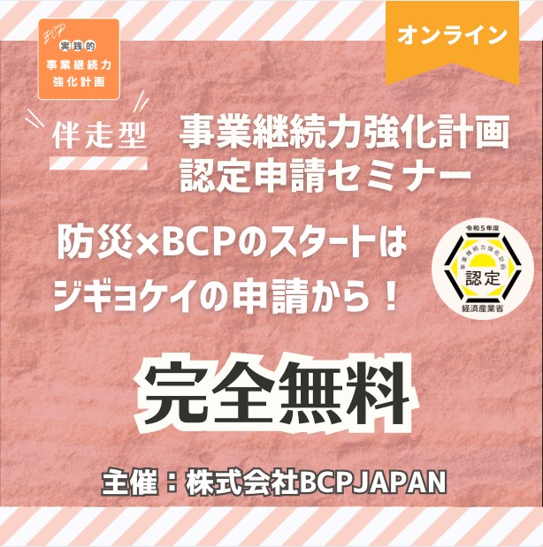 株式会社BCP JAPAN(本社:大阪市中央区|代表取締役:山口泰信)は、 中小企業が災害やサイバー攻撃などの危機に備えるための「事業継続力強化計画(=ジギョケイ)」を、 その場で実際に申請まで進められる無料オンライン実践セミナーを 2025年10月27日(月)19:00より開催いたします。 本セミナーは、国の認定制度を“わかりやすく・その場で・一緒に”進める実践型の伴走支援。 申請を難しく感じている中小企業や、補助金・金融支援を受けたい経営者に向け、 画面共有で電子申請を操作しながら「認定までの第一歩」を共に踏み出します。 セミナーの詳細・申込はこちらから:https://bcpshinsei.peatix.com/view