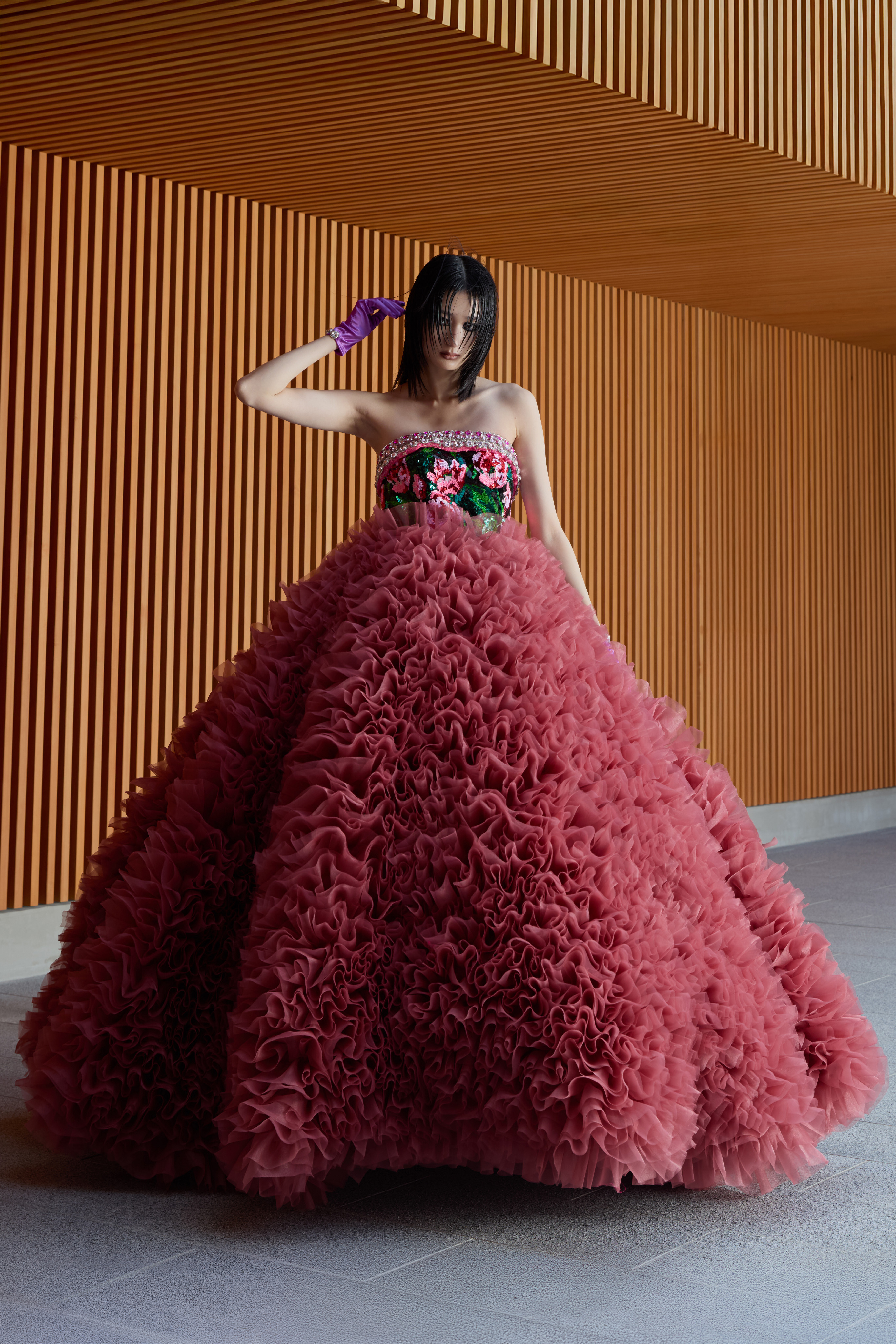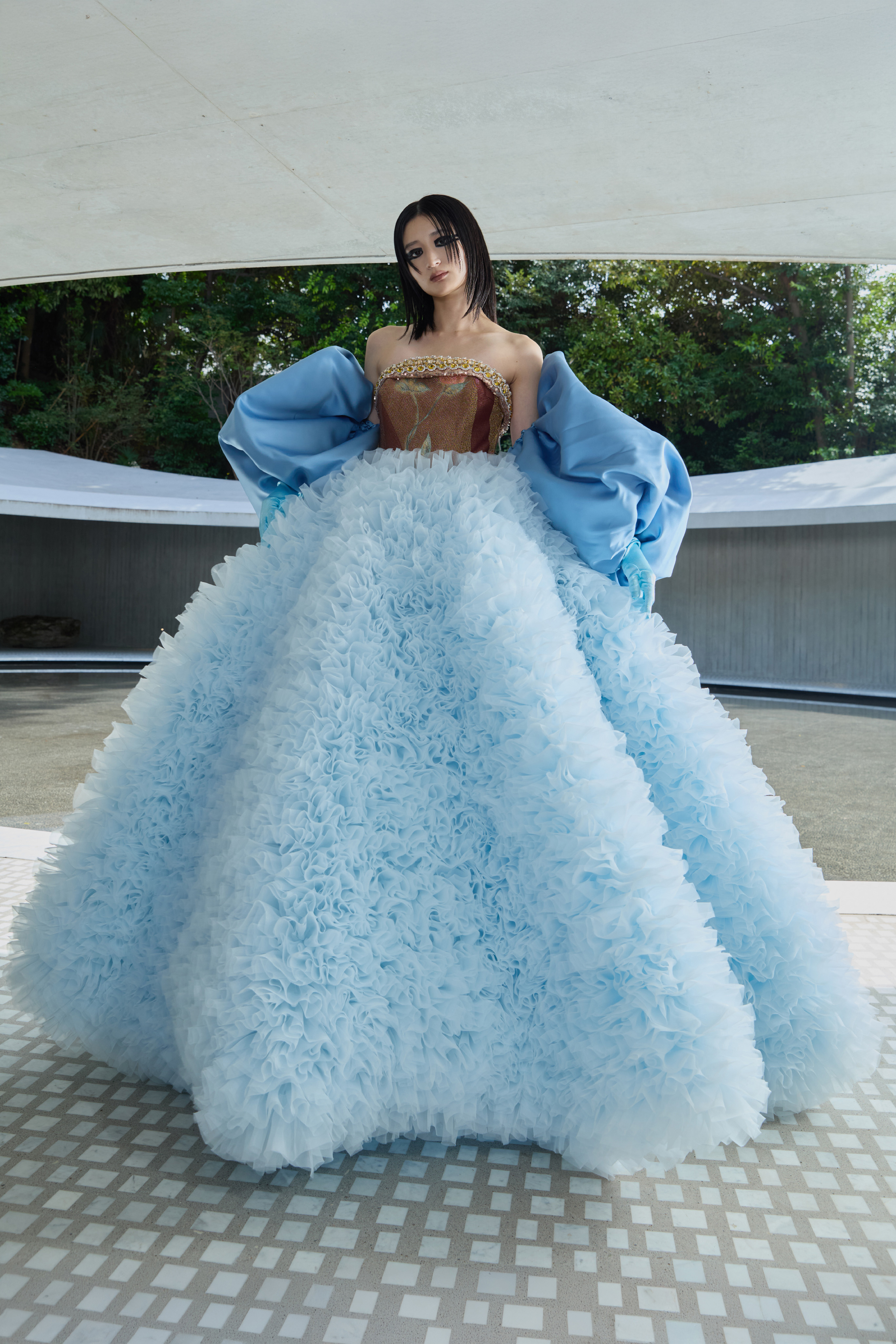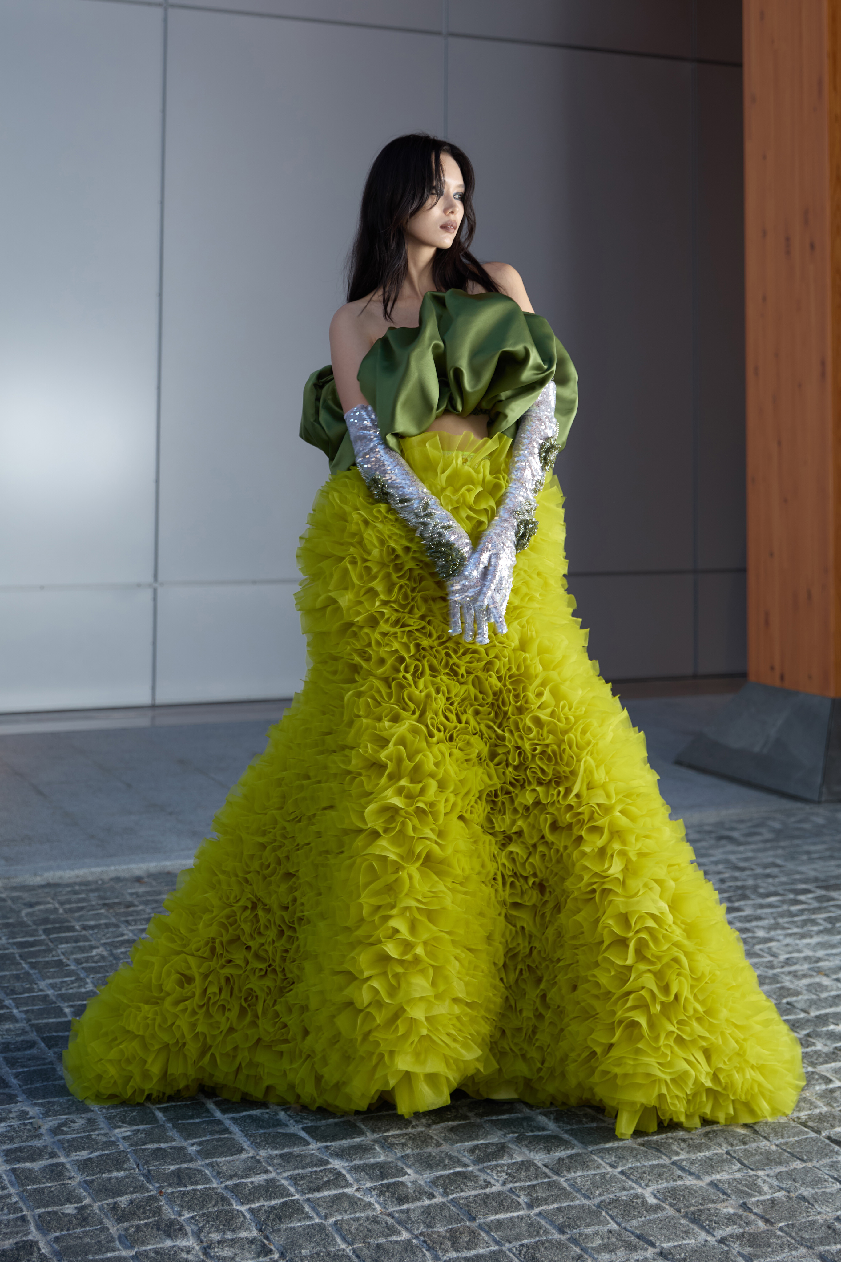 ウェストから裾元にかけて見事なグラデーションを奏でるフリルは、緻密に計算された構築的なパターンによって、より華やかなオーラを放ちます。