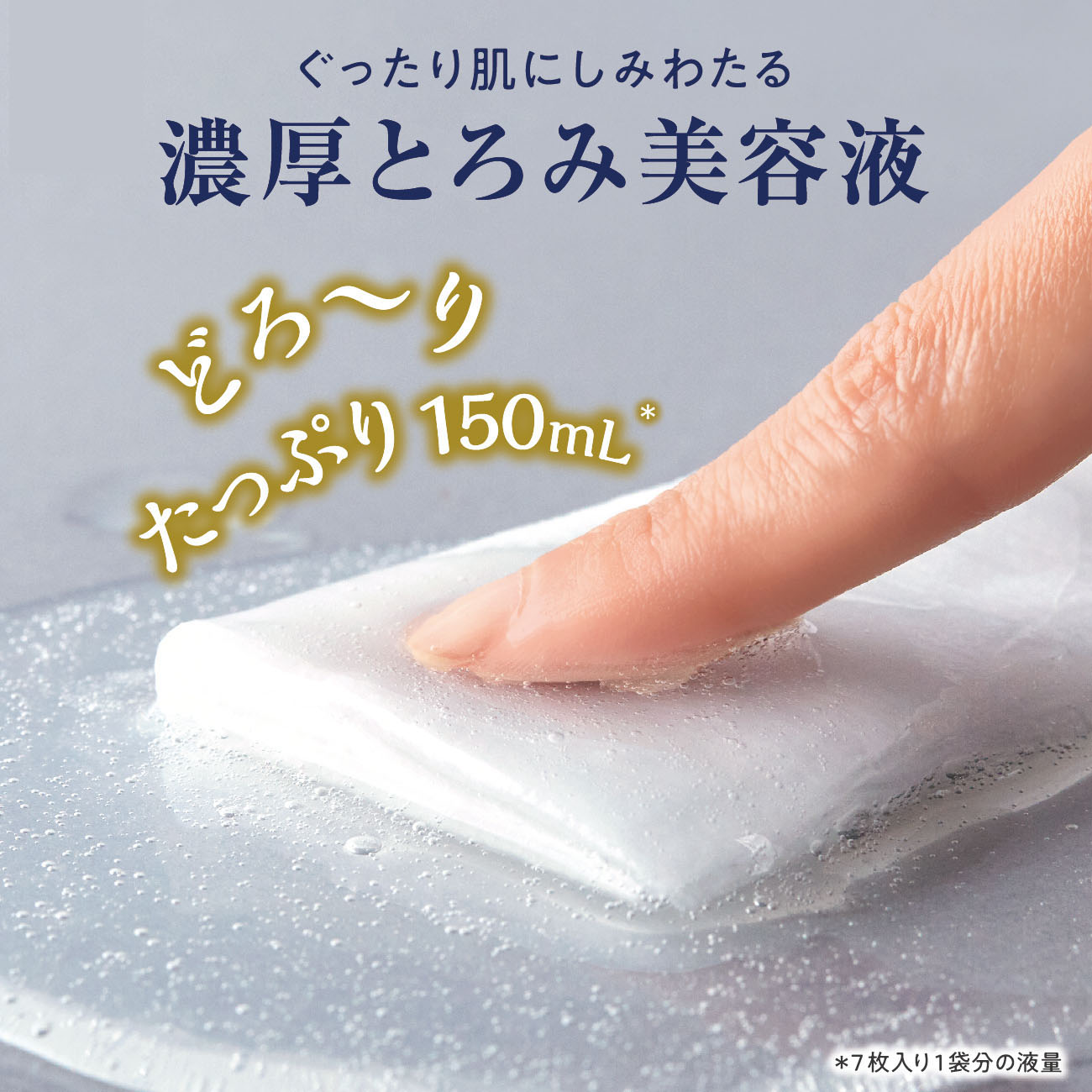 人気の整肌保湿成分を配合した濃厚とろみ美容液がたっぷり150mL*。角質層にしっかり浸透しうるおいを届けます。 *7枚入り1袋分の液量