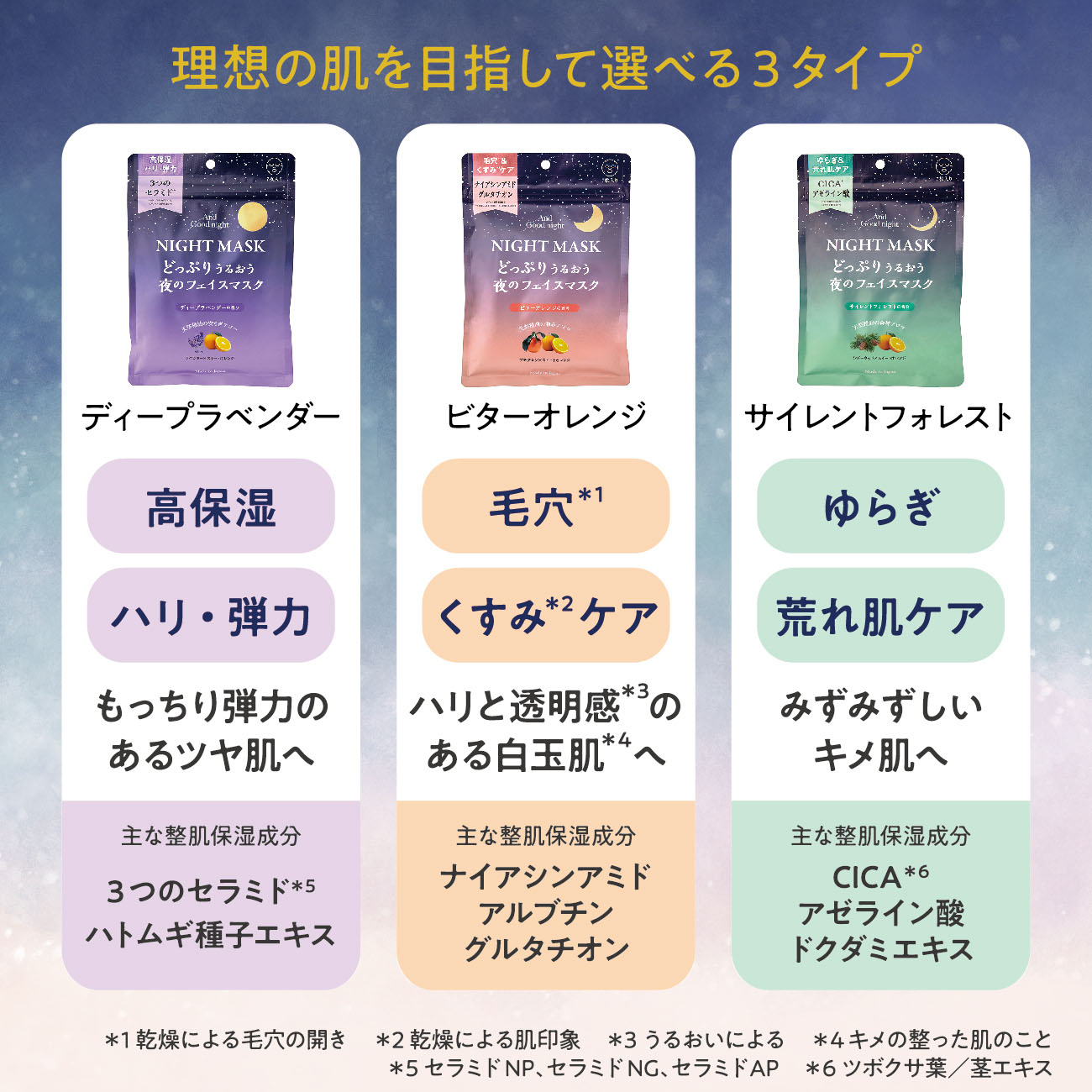 うるおいにどっぷり浸かる、濃厚とろみ美容液たっぷりのリッチな夜用フェイスマスク。肌あたりやわらかな厚手シートが肌に密着し、顔全体をしっかり包み込みます。理想の肌を目指して選べる3タイプ。1日の終わりのスペシャルナイトケアで心地よい明日へ。天然精油100%の香り 日本製