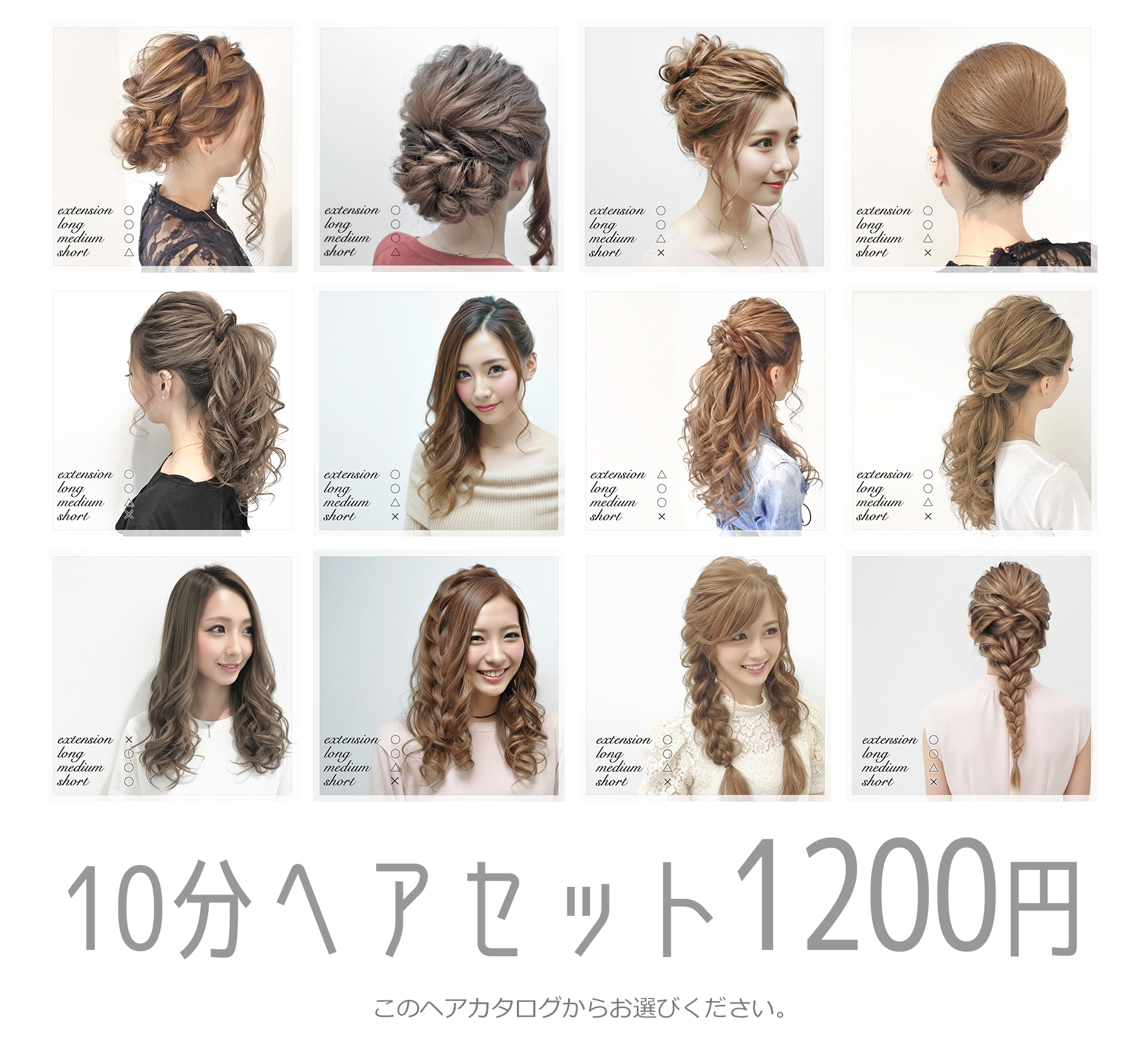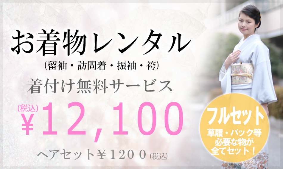 - ヘアセット1200円 1200円からの手軽な「10分ヘアセット」もご用意しており、着物選びからヘアセットまでトータルでのお支度がワンストップで完了します。